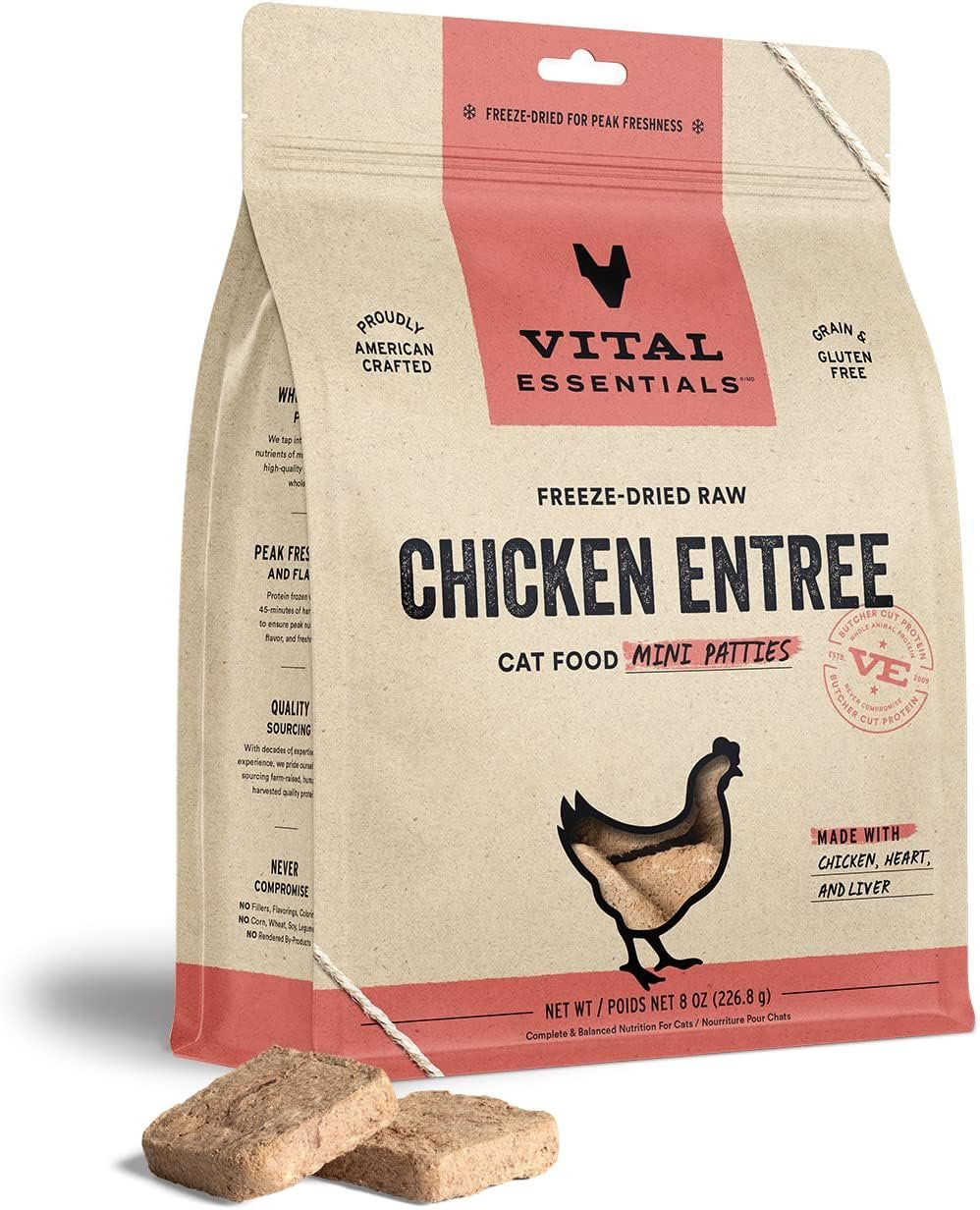 FREEZE-DRIED RAW CHICKEN CAT FOOD: Vital Essentials Freeze Dried Cat Food packs more protein than industry standard into every bite to deliver the peak vitality your cat deserves, especially when compared to dehydrated cat food. Our complete and balanced freeze-dried raw cat food is high in butcher cut premium chicken, responsibly sourced in the USA.