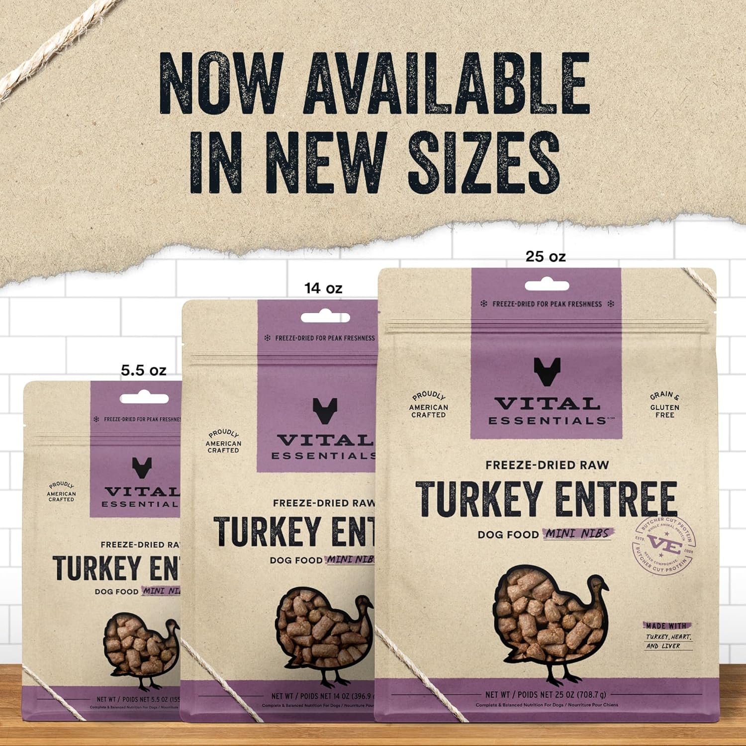 FREEZE-DRIED RAW TURKEY DOG FOOD: Vital Essentials Freeze Dried Dog Food packs more protein than industry standard into every bite to deliver the peak vitality your dog deserves, especially when compared to dehydrated dog food. Our complete and balanced freeze-dried raw dog food is high in butcher cut premium cage-free chicken, responsibly sourced in the USA.