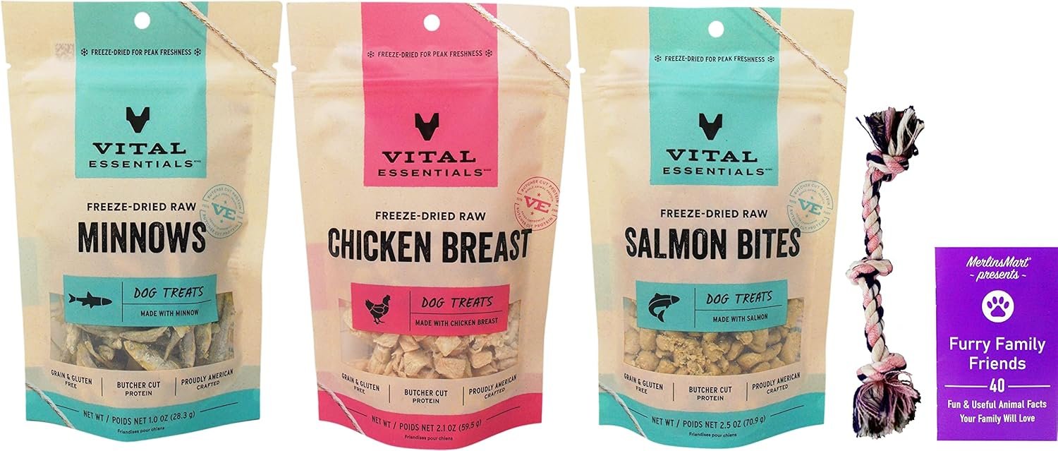 Bundle Includes: Vital Essentials Freeze-Dried Raw Dog Treats 3 Flavor Variety – (1) Each: Minnows, Salmon Bites, Chicken Breast (1-2.5 Ounces) – Plus Mammoth Rope Toy; Bundle Includes: MerlinsMart Furry Family Friends 40 Fun & Useful Animal Facts Your Family Will Love Booklet. Gluten Free; Grain Free; Limited Ingredients; Made in the USA; Serve dry as a treat or moisten to supplement a meal. Interactive Mammoth rope toy; (color will vary); Convenient 3 flavor variety sampler. This item is not a manufacturer-created variety pack and will not be sent in the original manufacturer’s packaging.