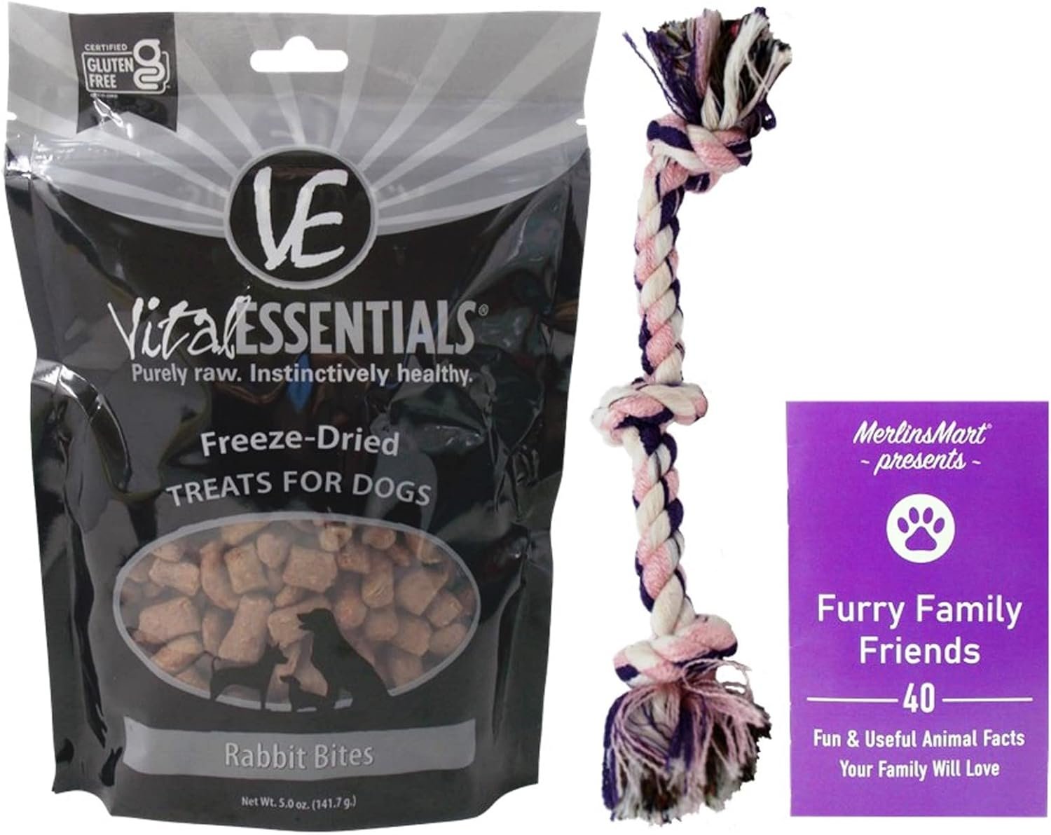 Bundle Includes: Vital Essentials Freeze-Dried Raw Natural Dog Treats – Rabbit Bites (5 Ounces) – Plus Mammoth Rope Toy; Bundle Includes: MerlinsMart Furry Family Friends 40 Fun & Useful Animal Facts Your Family Will Love Booklet