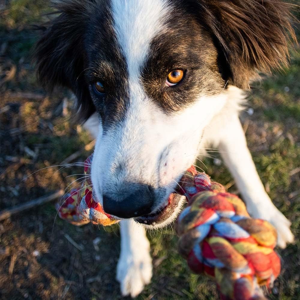 Cute interactive Mammoth 3 Knot Rope Toy is about 10″ long (color will vary)