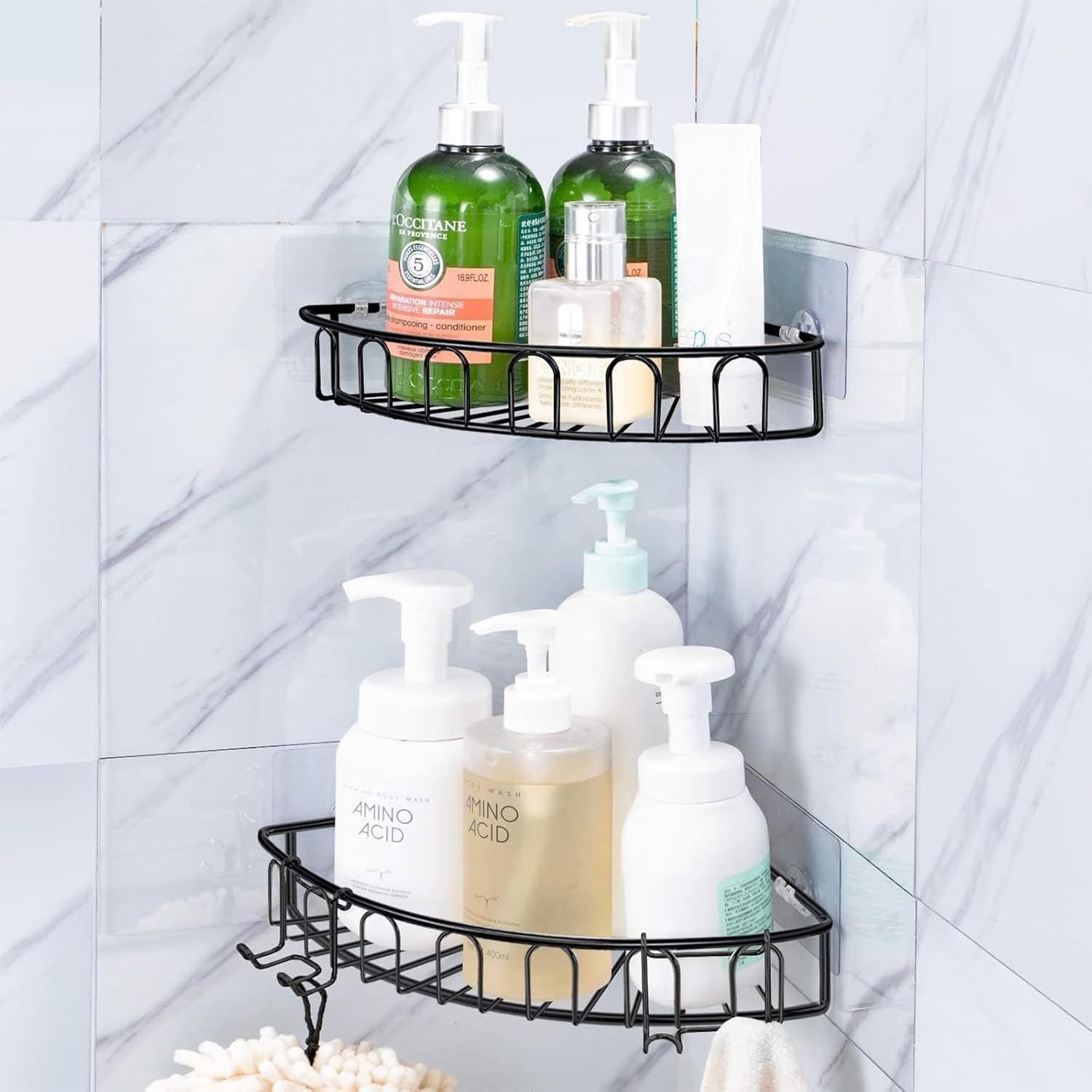 Strong shower shelf adhesive: Our adhesive shower hooks are waterproof and rust-proof, non-discoloration, and scratch-resistant. The adhesive shower hook has strong adhesion, and up to 30lb load can be hung on the shower caddy, shower basket shelf, kitchen storage organizer, soap holder, and shelves without any problems.