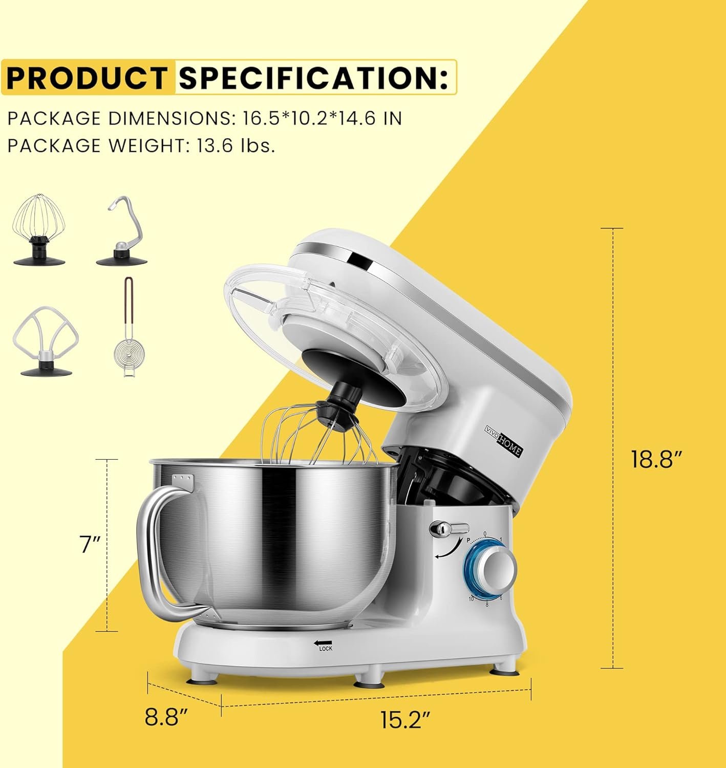 POWERFUL MOTOR – High-performance 660W motor finishes kneading and mixing quickly and thoroughly than human hands; Handy 10-speed control with a pulse function can satisfy precise needs for various mixing tasks; Heavy-duty metal gears lead to stable and quiet working; Features 2 heat vents outlets, the VIVOHOME mixer has a rapid heat dissipation for long service life