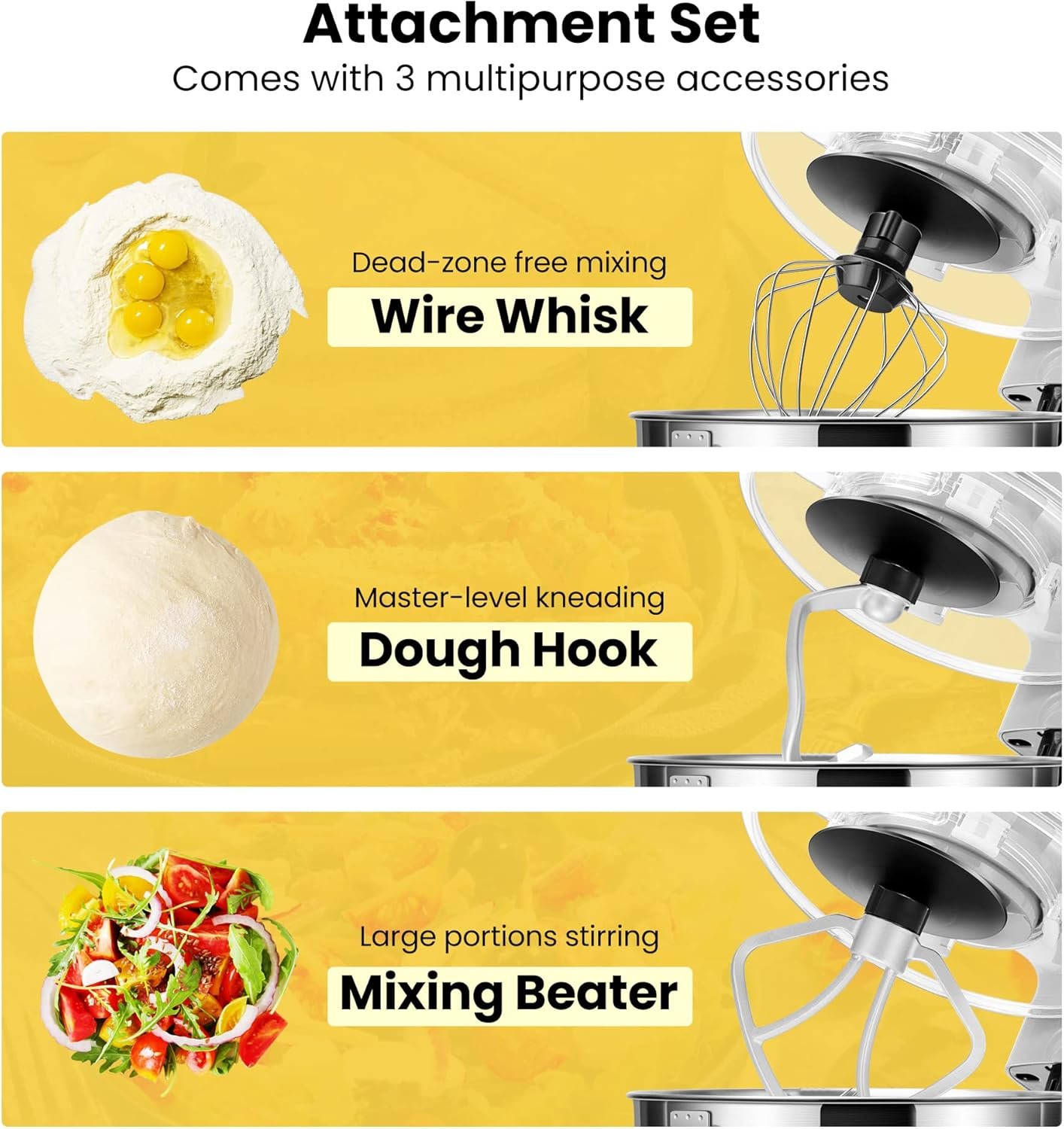 DURABLE ATTACHMENT SET – Comes with 4 durable multipurpose accessories: stainless steel wire whisk, aluminum dough hook, mixing beater coating with Teflon, and an egg yolk separator; These different tool accessories match various kitchen needs, such as making dough, biscuits, pastries, muffins, waffles, etc.; Notice: The attachments are not dishwasher safe
