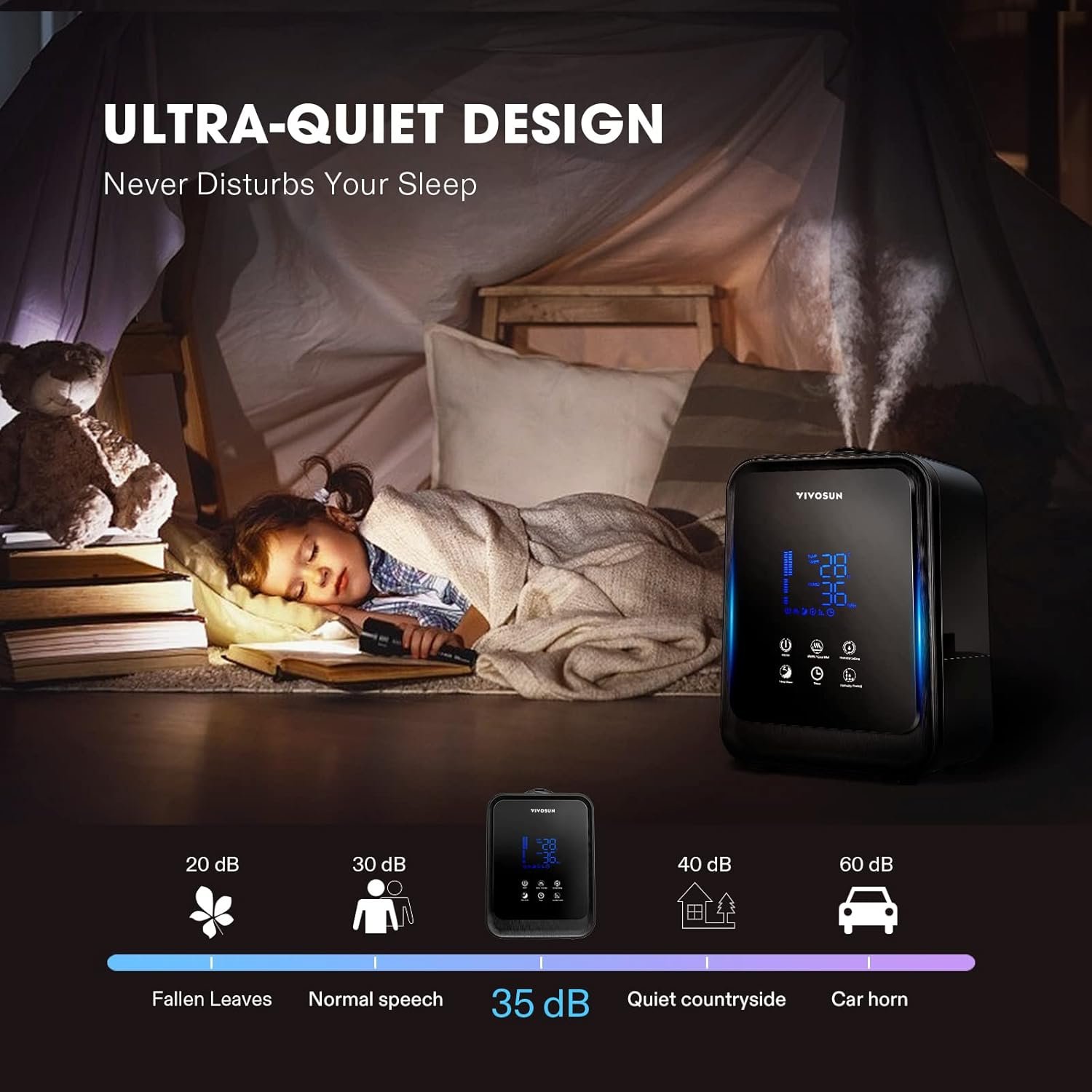 Ultra-quiet + Sleep Mode + Timer: Our mini humidifier runs so quietly it’s almost silent (<35 dB)—you'll be sure to get a good night of rest while it's running; Set it on sleep mode to turn off all sounds; Comes equipped with a timer function with four options: 1/2/4/8 hours