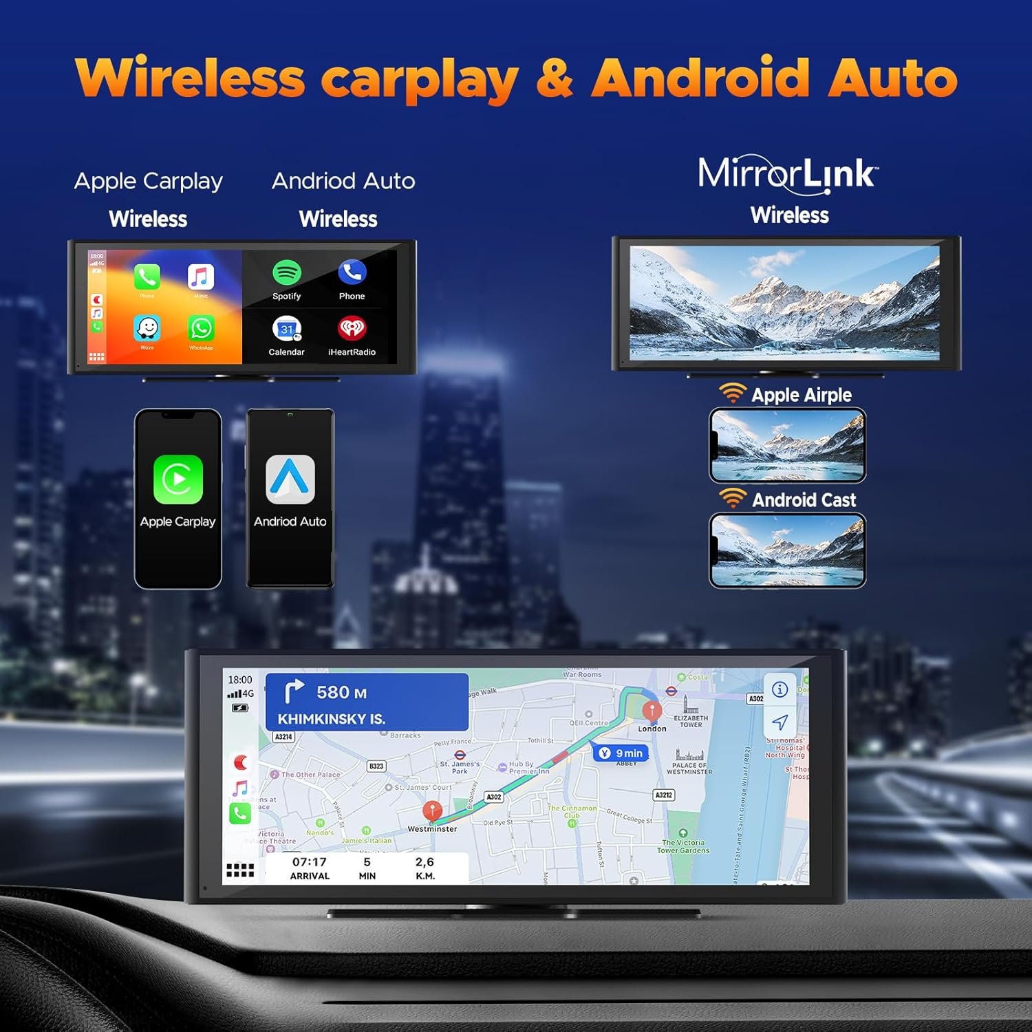 【Wireless Carplay & Android Auto】The portable Apple CarPlay connects via WiFi and Bluetooth, bringing your phone apps to the car screen. Enjoy the latest navigation maps and music apps such as Spotify, Google Maps, and Waze.