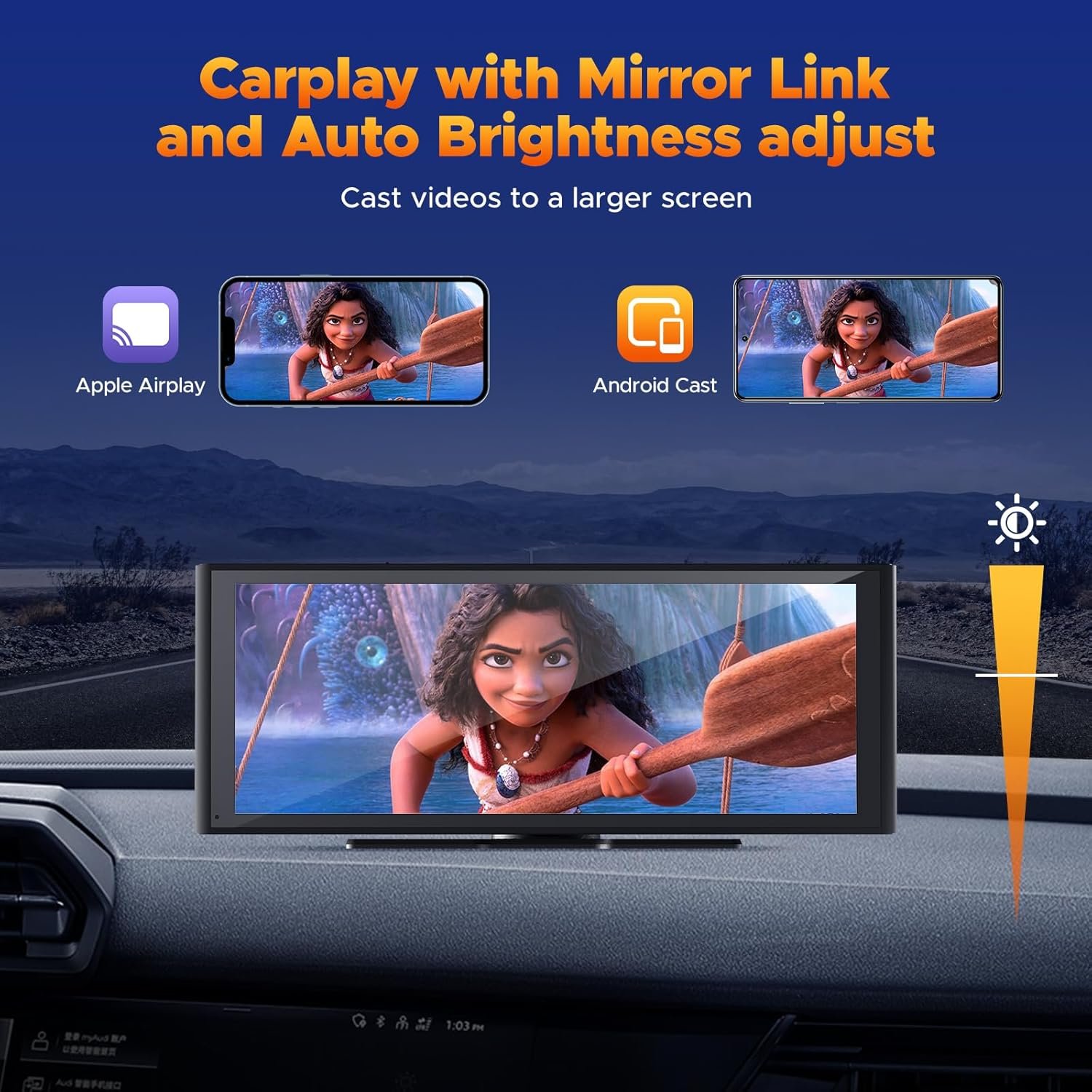 【Mirror Link & Automatic Dimming system】Portable CarPlay realizes mirror link through Apple Airplay and Android Cast, projecting the video content in the mobile phone to the larger car screen, At the same time, the Apple CarPlay screen supports the photosensitive system, which can automatically adjust the brightness of the Apple Car Play screen according to the surrounding light, Avoid eye damage and drive more