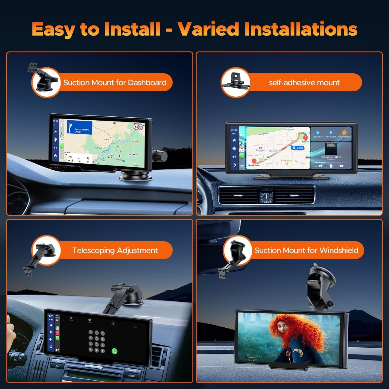 【Universal Compatibility & Easy Installation】 Volam carplay screen for car is equipped with a 360-degree rotatable suction cup mount and self-adhesive bracket, which can be firmly fixed on the dashboard console or windshield. It is very easy to remove and convenient to store, the screen is powered by a versatile 12-36V cigarette lighter socket, which is compatible with various vehicles, trucks, trailers, etc.