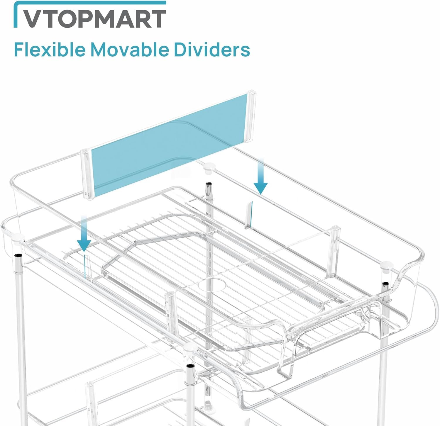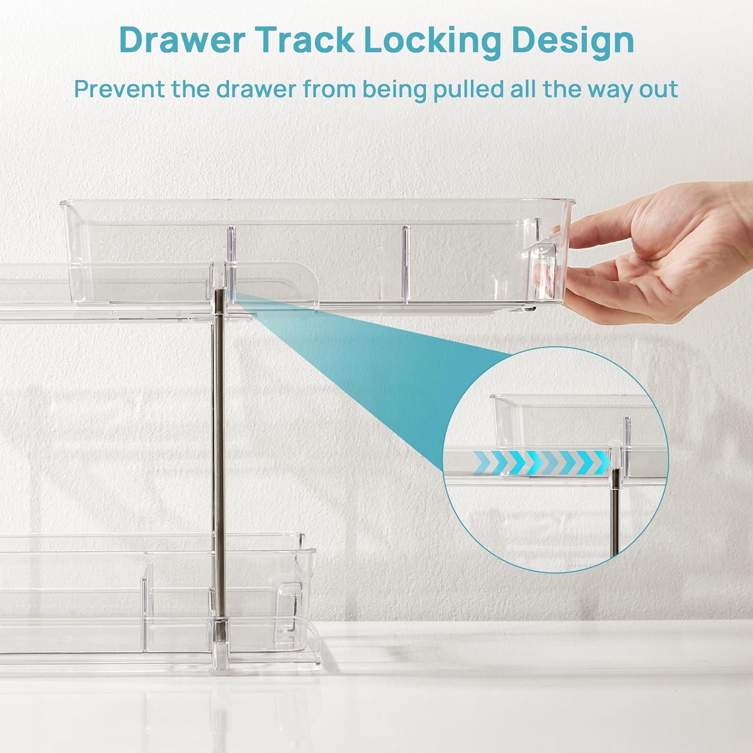 Slide-out Drawer & Upgrade Track Locking Design —The 2-tier storage organizer features two pull-out drawers with tracks to prevent swaying during use and a built-in handle makes it easy to access hard-to-reach things. We have also incorporated a newly added drawer track locking design to ensure that the drawers do not come completely out, providing an added layer of security. In addition, the bottom is fitted with non-slip pads to ensure stability when pulling the organizer drawer out.