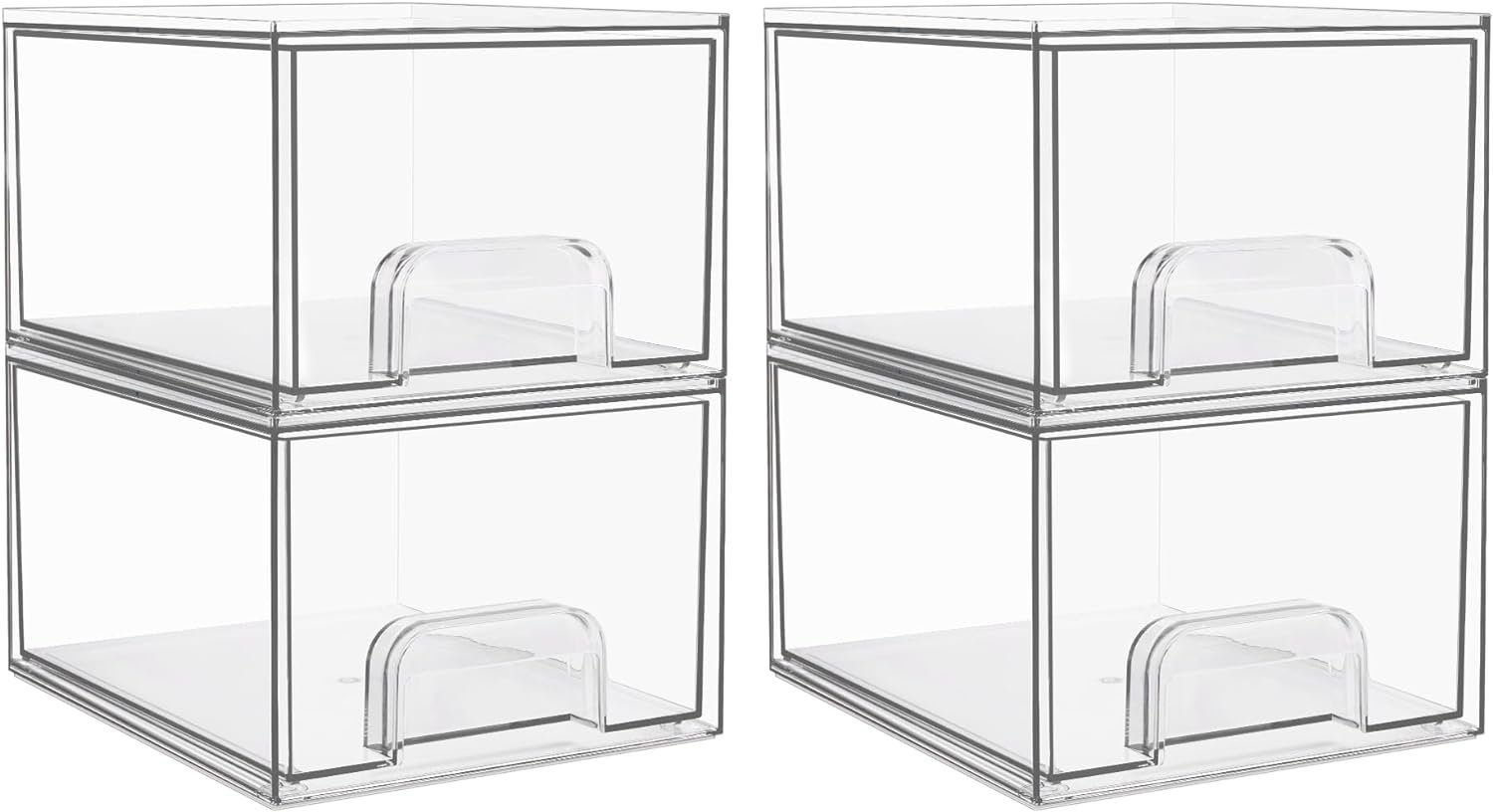 [Stackable Design] Come with 4 drawer storage organizers, each organizer measures 7.5″D x 6″W x 4.4″H. The storage containers are stackable, vertical storage will save a lot of space. You can also use them side by side. Put your small objects on top of acrylic bins to make your countertop space more tidy.
