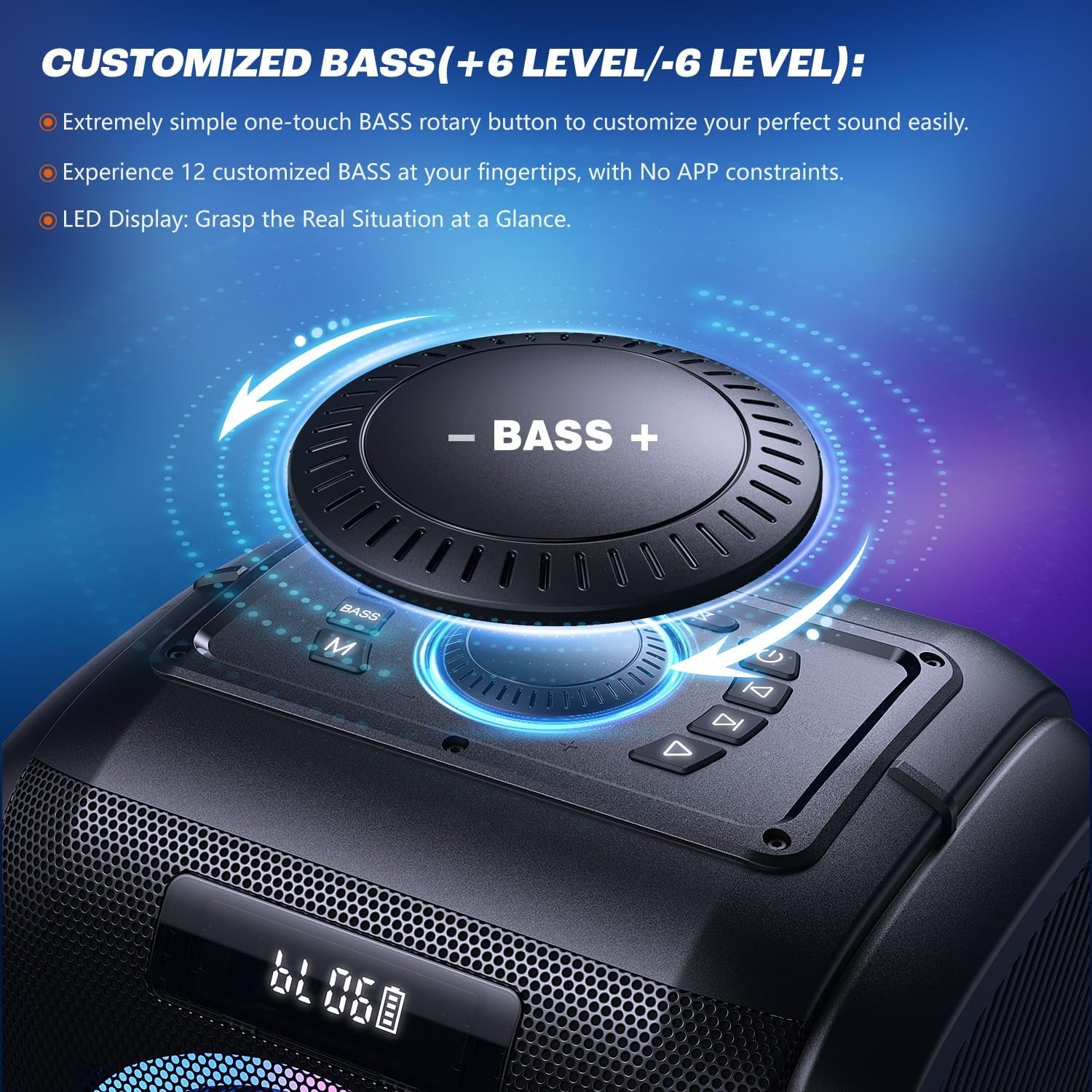 12 CUSTOM BASS(EQ) & USER-FRIENDLY DISPLAY: Experience great custom bass without an app! The T9 PRO features a bass control panel with 12 customized BASS, and ONE click to activate BASS mode, The rotation operation lets you customize EQ for your mic and music, aligning with your preferences. The digital display shows volume, bass level, playback mode, and battery information. Suitable for all age groups, it provides an unparalleled, relaxed experience easily accessible to the elderly.