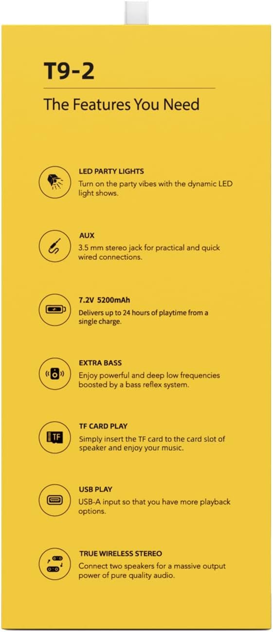 Product Guarantee; Enjoy our 12-month warranty and friendly customer service. The package includes the T9-2 party portable speaker(2*4.04″ Subwoofers, 2*1.2″ tweeters), charging cable, 3.5mm AUX cable, and user manual. If you encounter any issues with our products, please don’t hesitate to contact us, and we will be more than happy to assist you in resolving the problem.