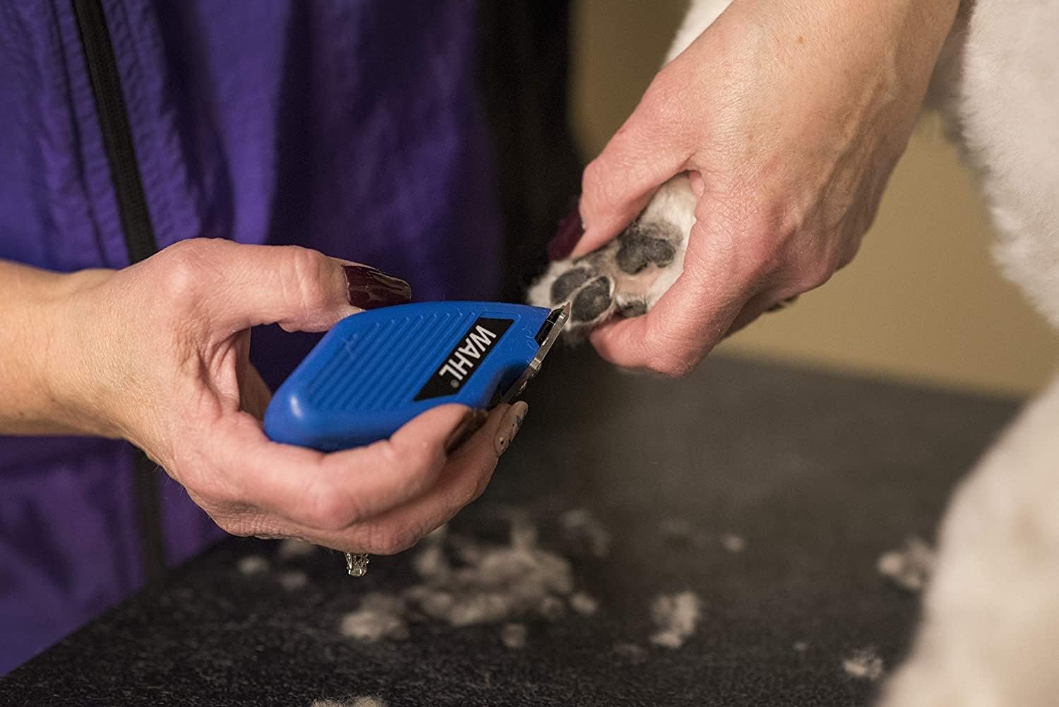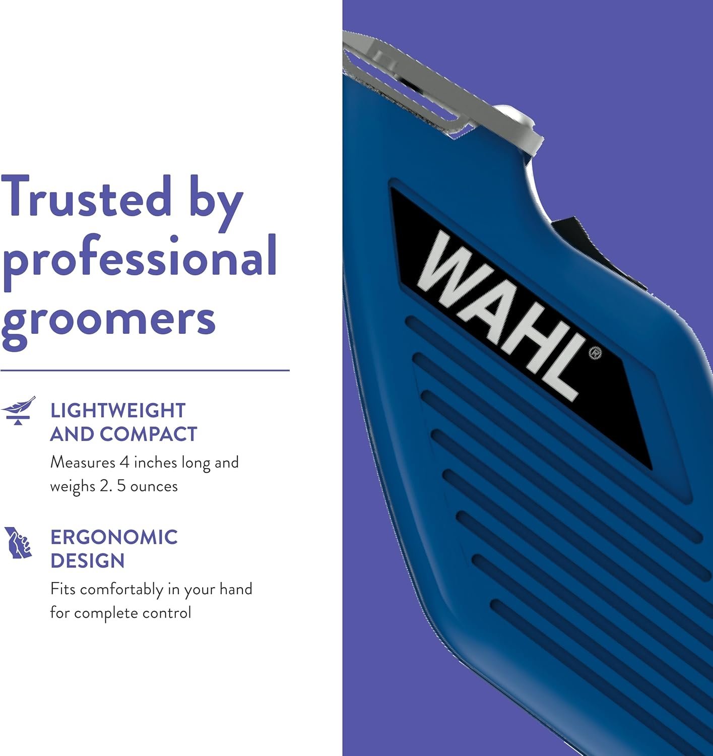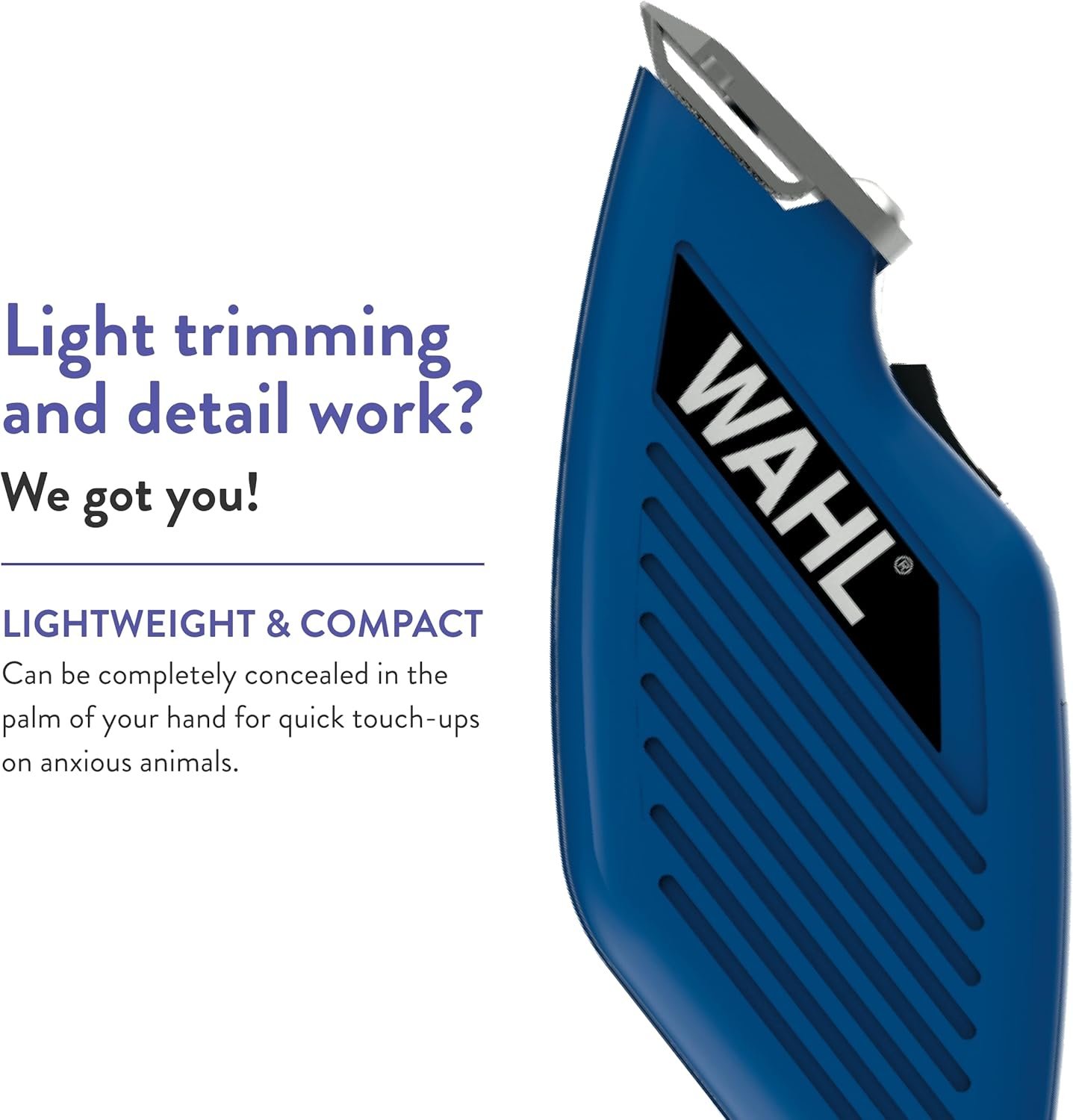 Small, lightweight trimmer can be completely concealed in the palm of your hand for quick touch-ups on anxious animals