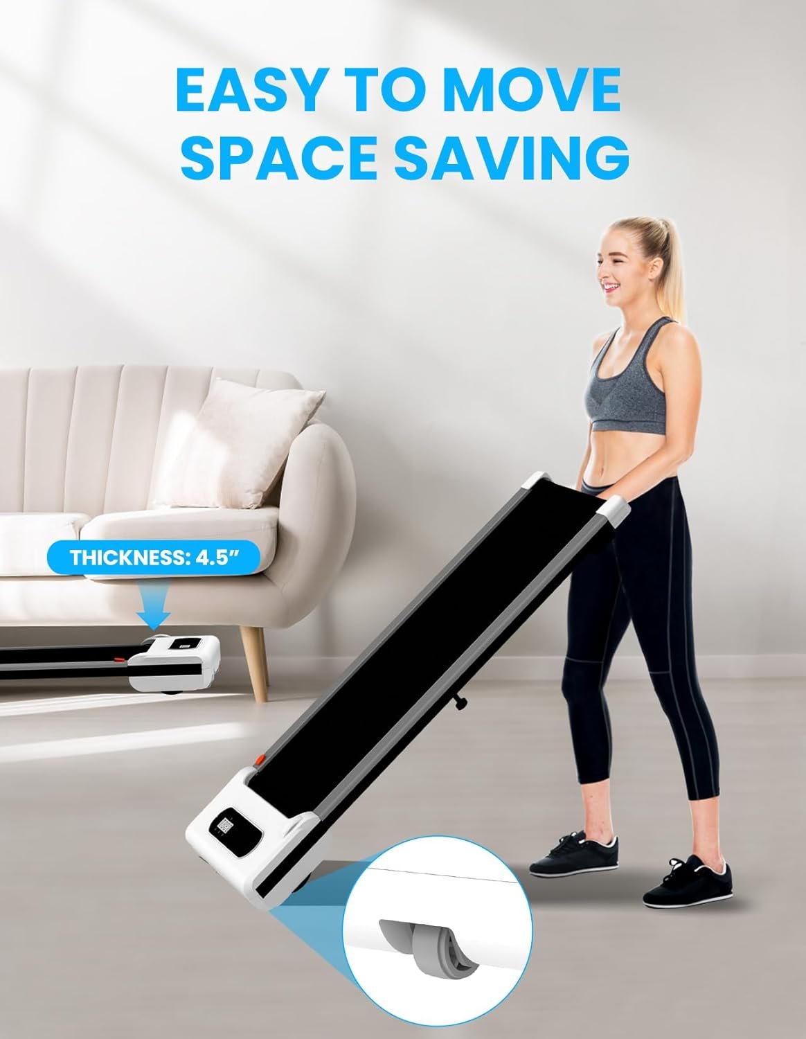 SPACE SAVER – Under desk walking pad has a compact design. The body size is only 47.6*20*4.5 inches which can be easily stored under a sofa or a desk when not in use, suitable for small spaces and the two wheels on the bottom provide easy transportation, you can choose the right place to exercise.
