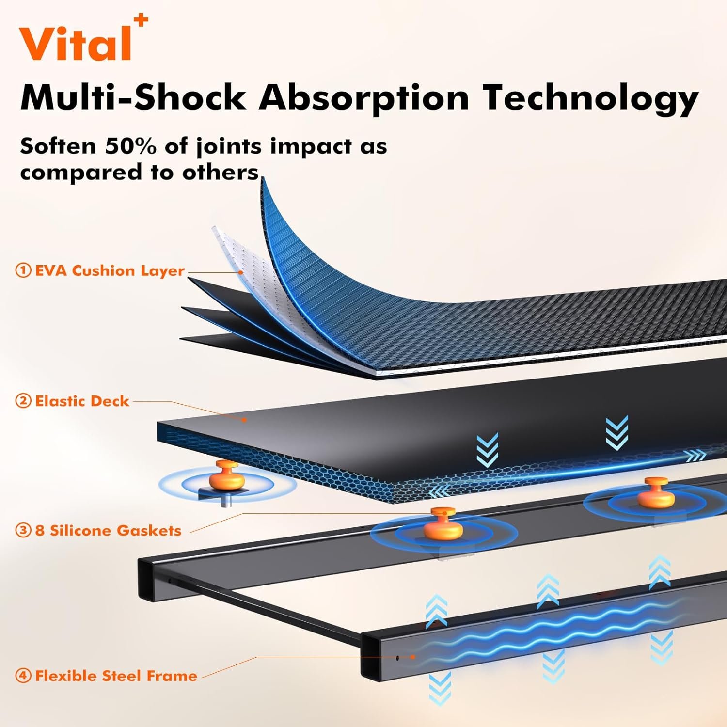 🏃【Vital+】Vitalwalk’s Vital+ multi-shock absorption technology combines multiple mechanisms to minimize the impact of exercise on joints. This under desk treadmill integrates an EVA cushion layer, an elastic deck, 8 silicone gaskets, and a flexible steel frame, which work in harmony to provide unparalleled cushioning.