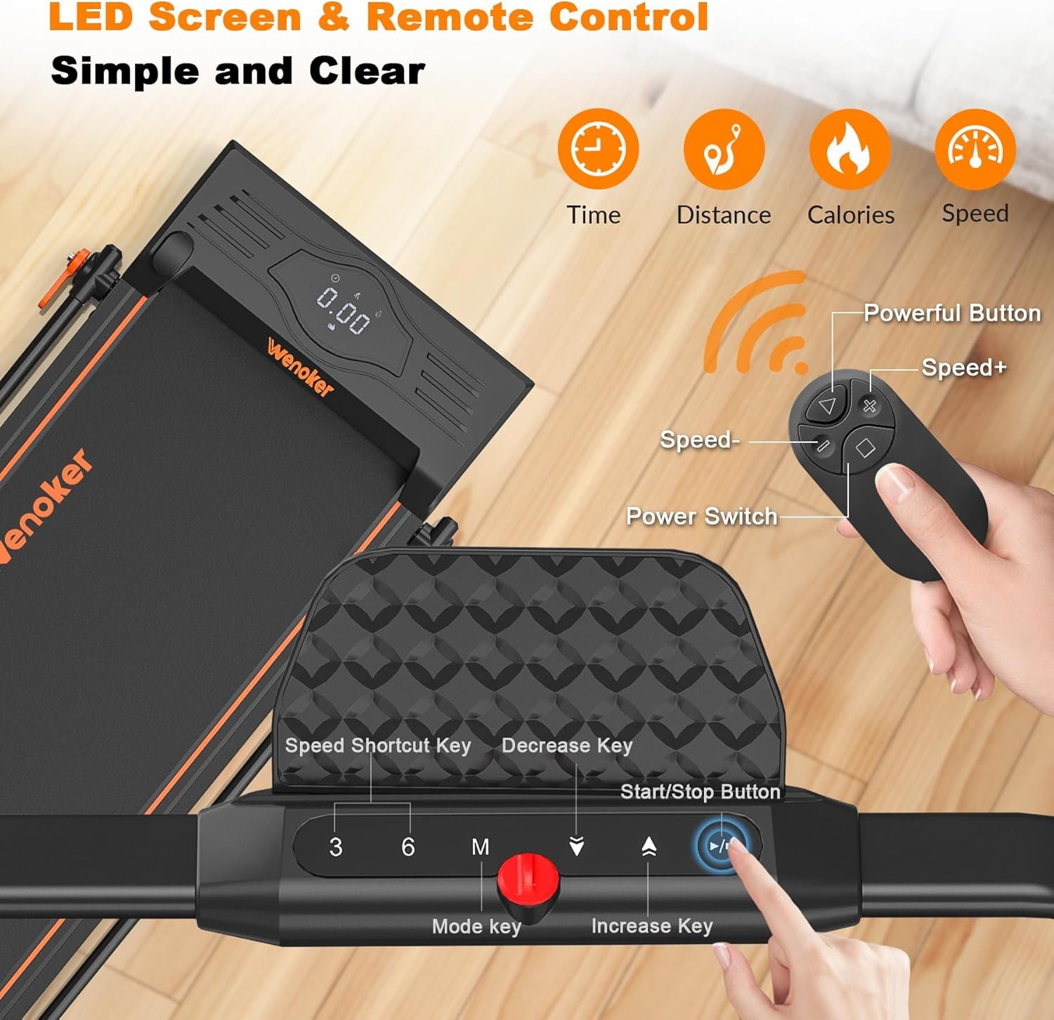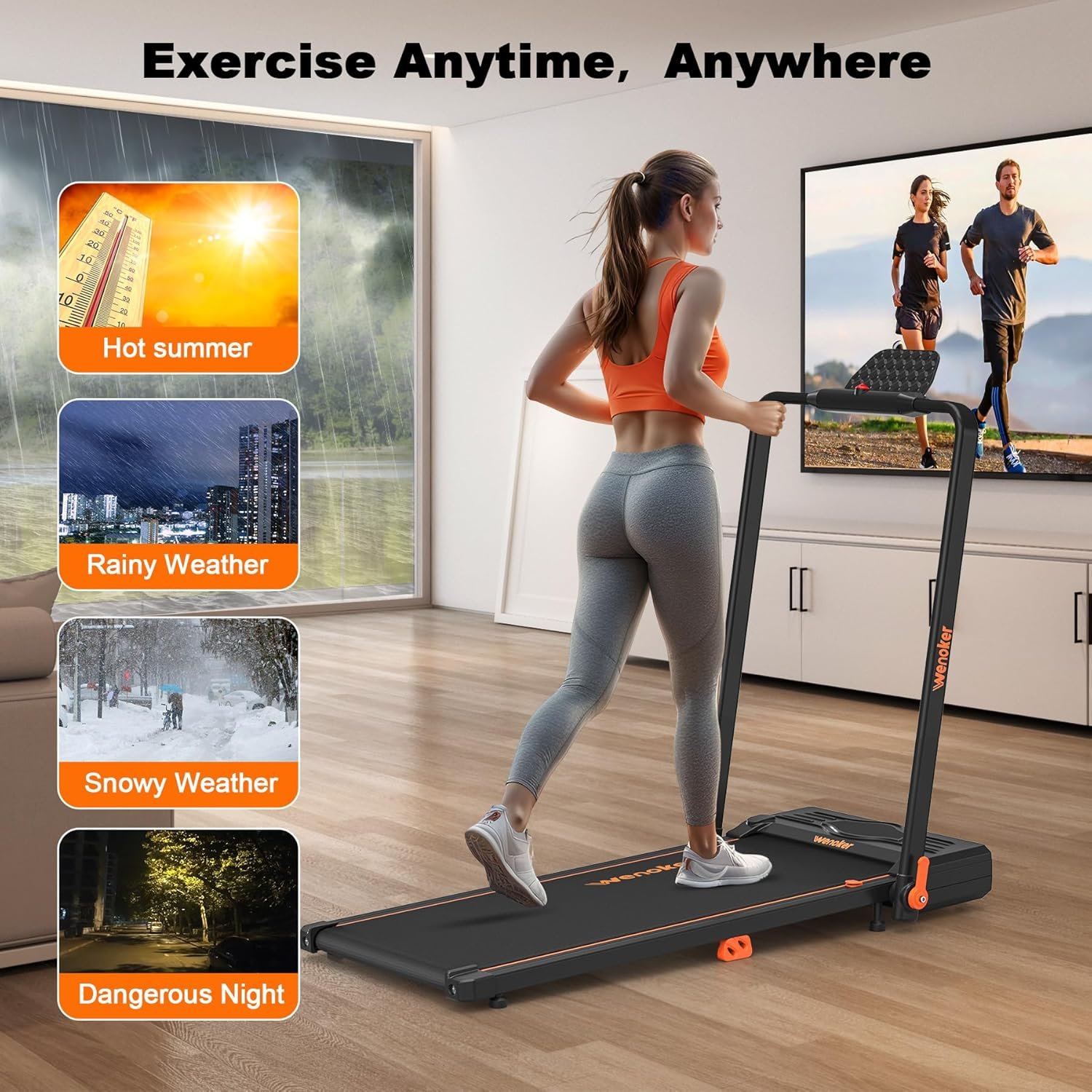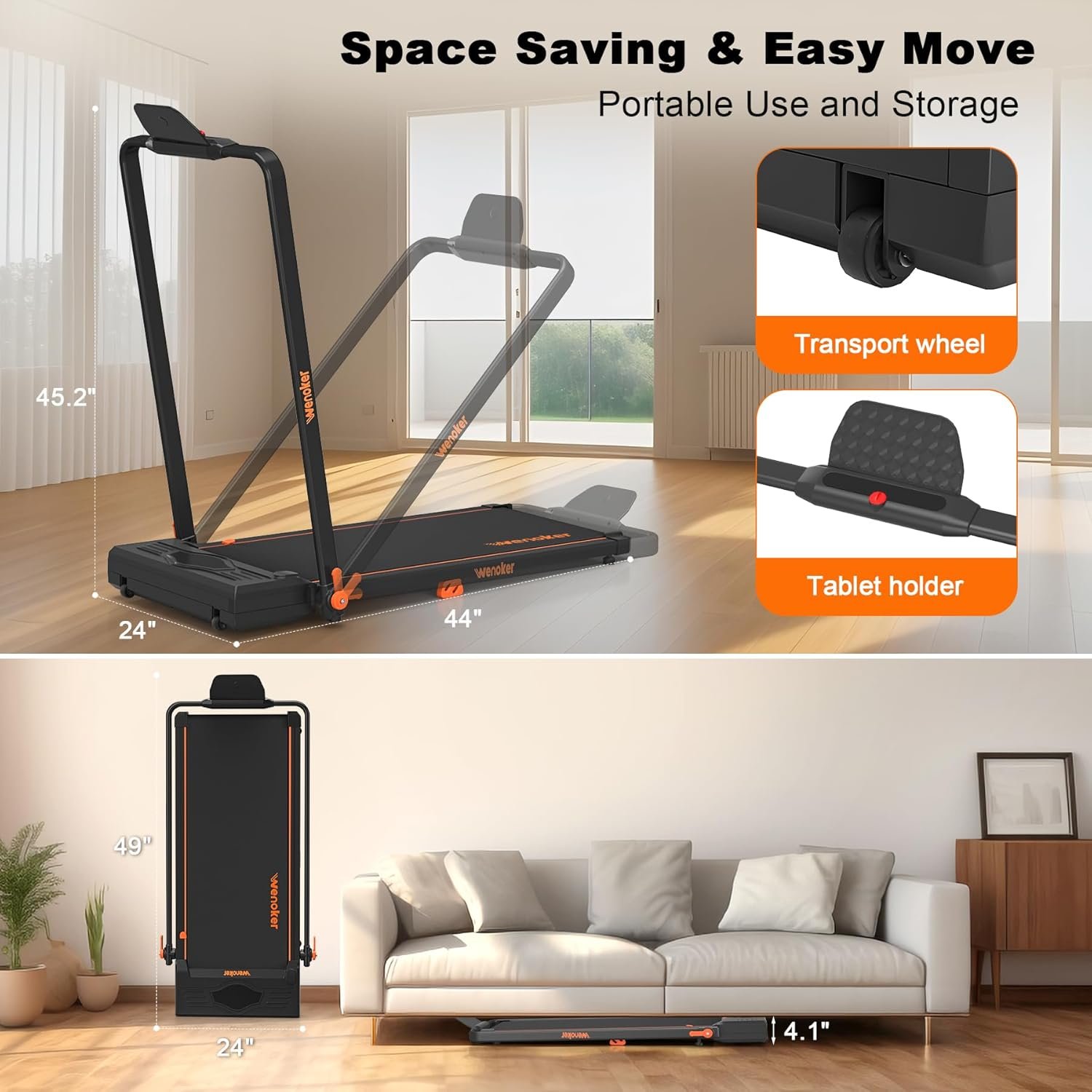 [Stay Fit, stay Healthy] Did you know that regular exercise on a treadmill can improve your mental health, reduce stress, and boost your mood? Our treadmill designed for sedentary office workers, seniors who need exercise, and people who want to lose weight, since it helps strengthen your muscles, improve your flexibility, and burn calories effectively. Wenoker treadmill allows you to keep running or walking during bad weather.
