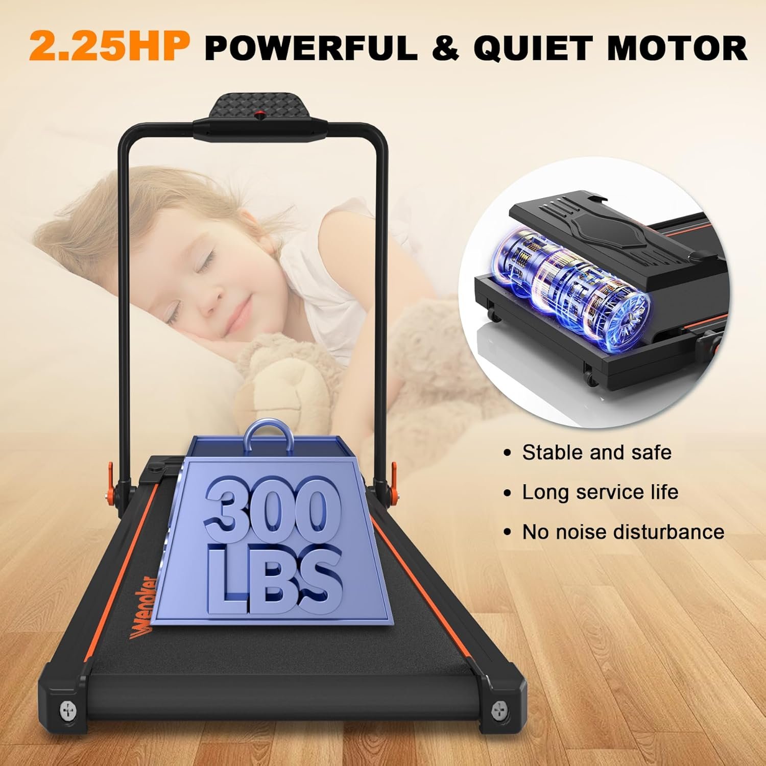 [Powerful and Silent Motor] The walking pad treadmill is equipped with a 2.25 HP motor with a maximum load of 300 LBS while keeping the operating noise level lower than 50 dB. The powerful motor of this desk treadmill not only has a stable and high weight capacity but is also very quiet. Perfect for people in the office and at home who like to take calls while walking or work at a standing desk.