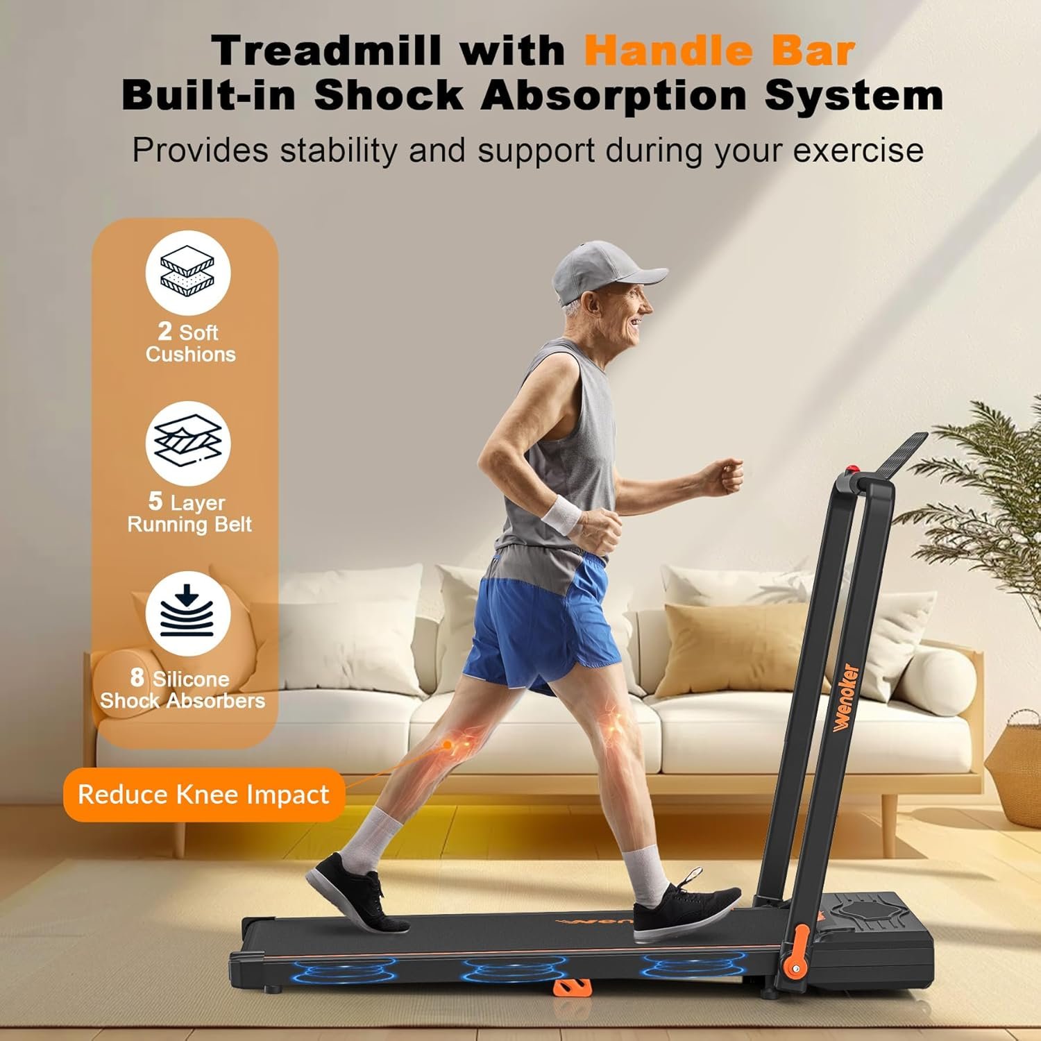 [To Keep you Safe and Healthy] Compared with walking pads without handlebars, Wenoker’s folding handles are designed to better protect people who need to help balance while walking, which will make the treadmill more stable during use.The 5-layer running belt and shock-absorbing column support design can greatly absorb the impact caused by exercise and provide protection for knees, muscles, and ankles.