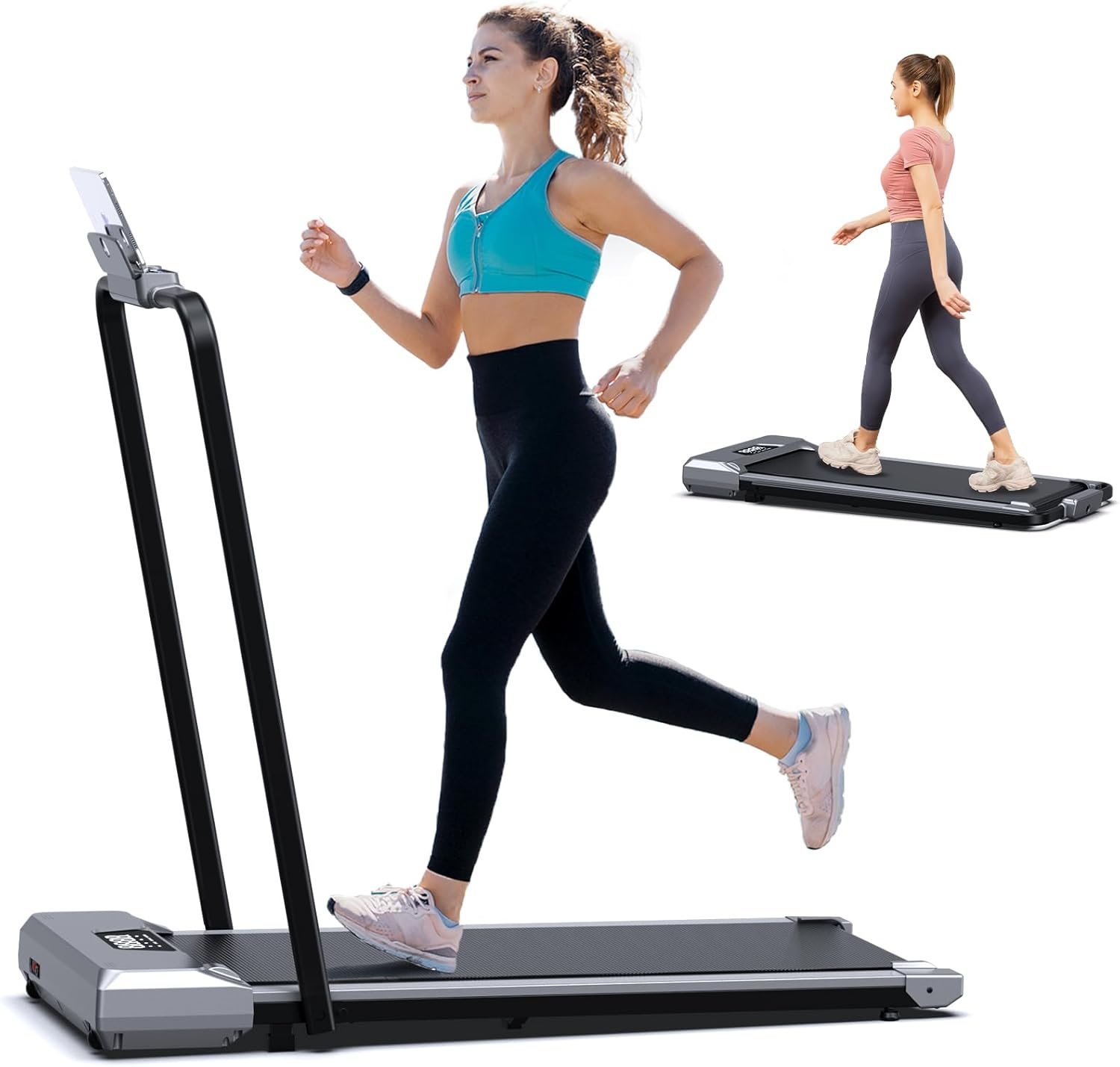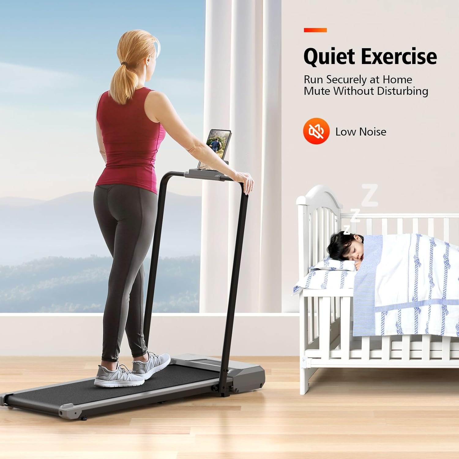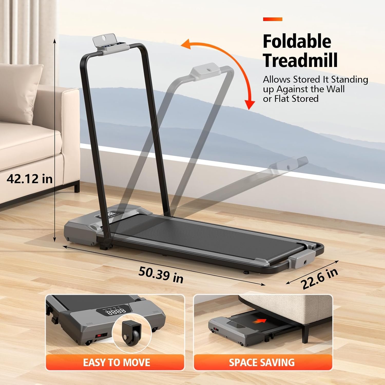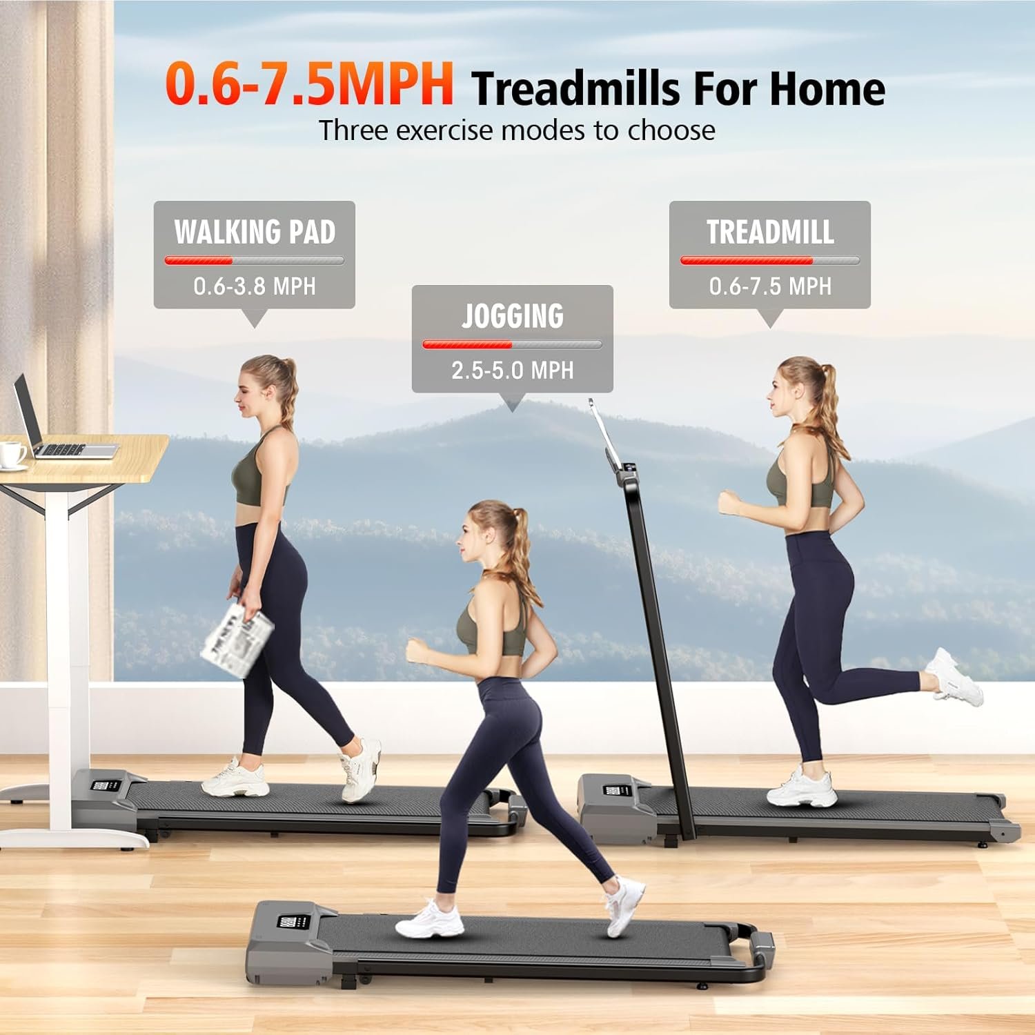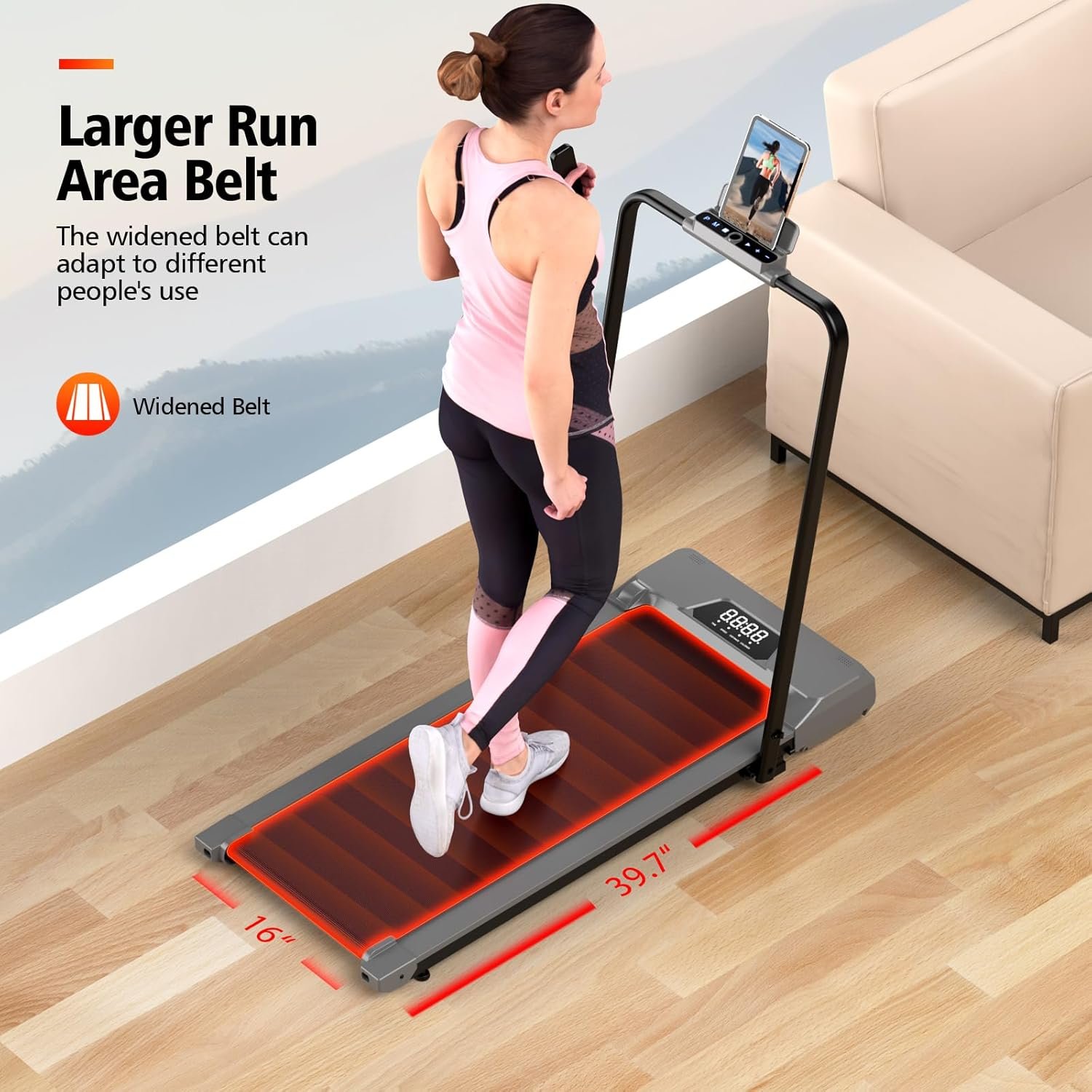 [DUAL FUNCTIONS] – 2-in-1 under desk treadmill, serves both as a treadmill and an under-desk walking pad. When the handle is folded, the speed ranges from 0.6 to 4 MPH, and when the handle is raised, the speed ranges from 0.6 to 7.5 MPH. Lightweight and compact, it caters to the fitness preferences of the whole family. Longer and wider running bands are also suitable for large pets: cats and dogs.