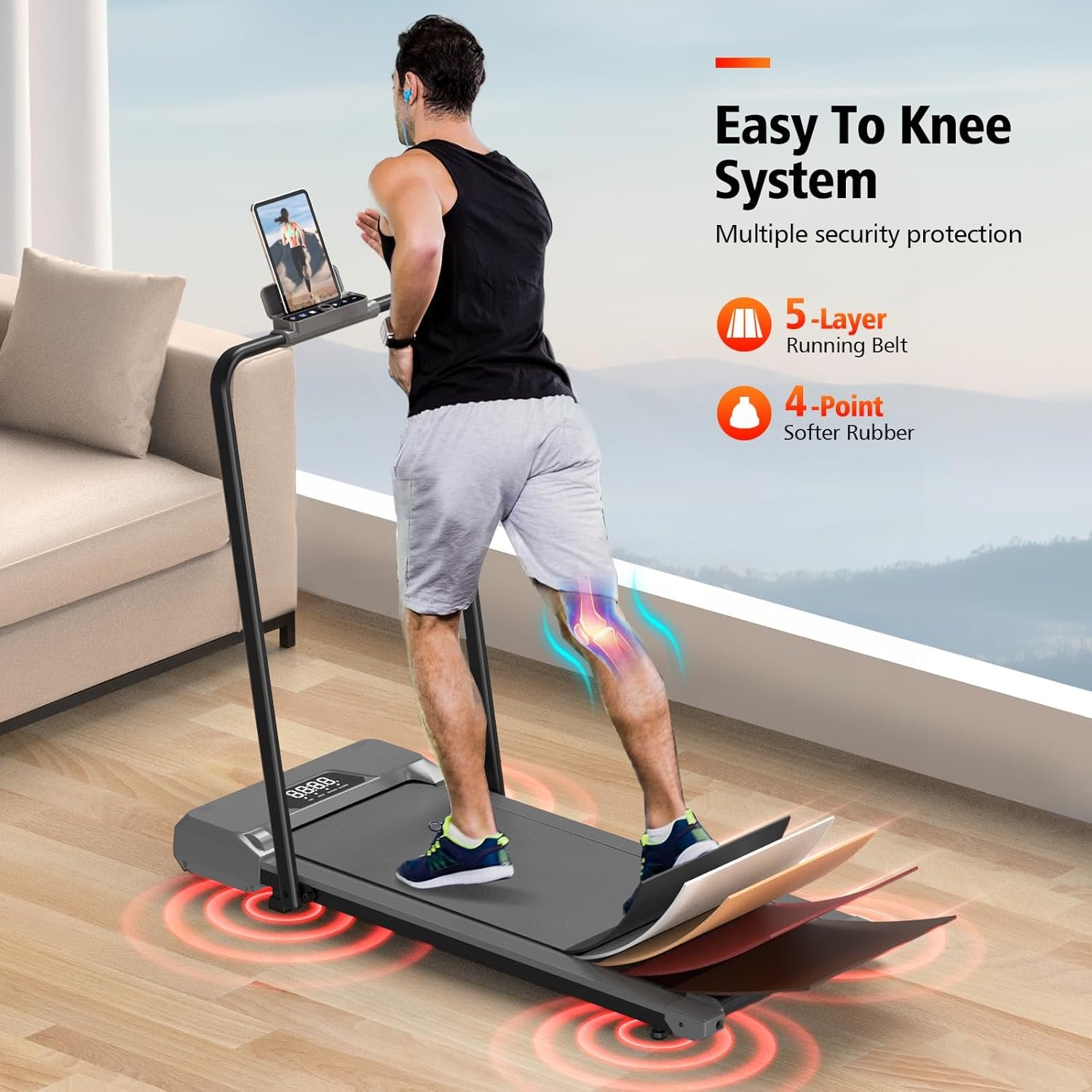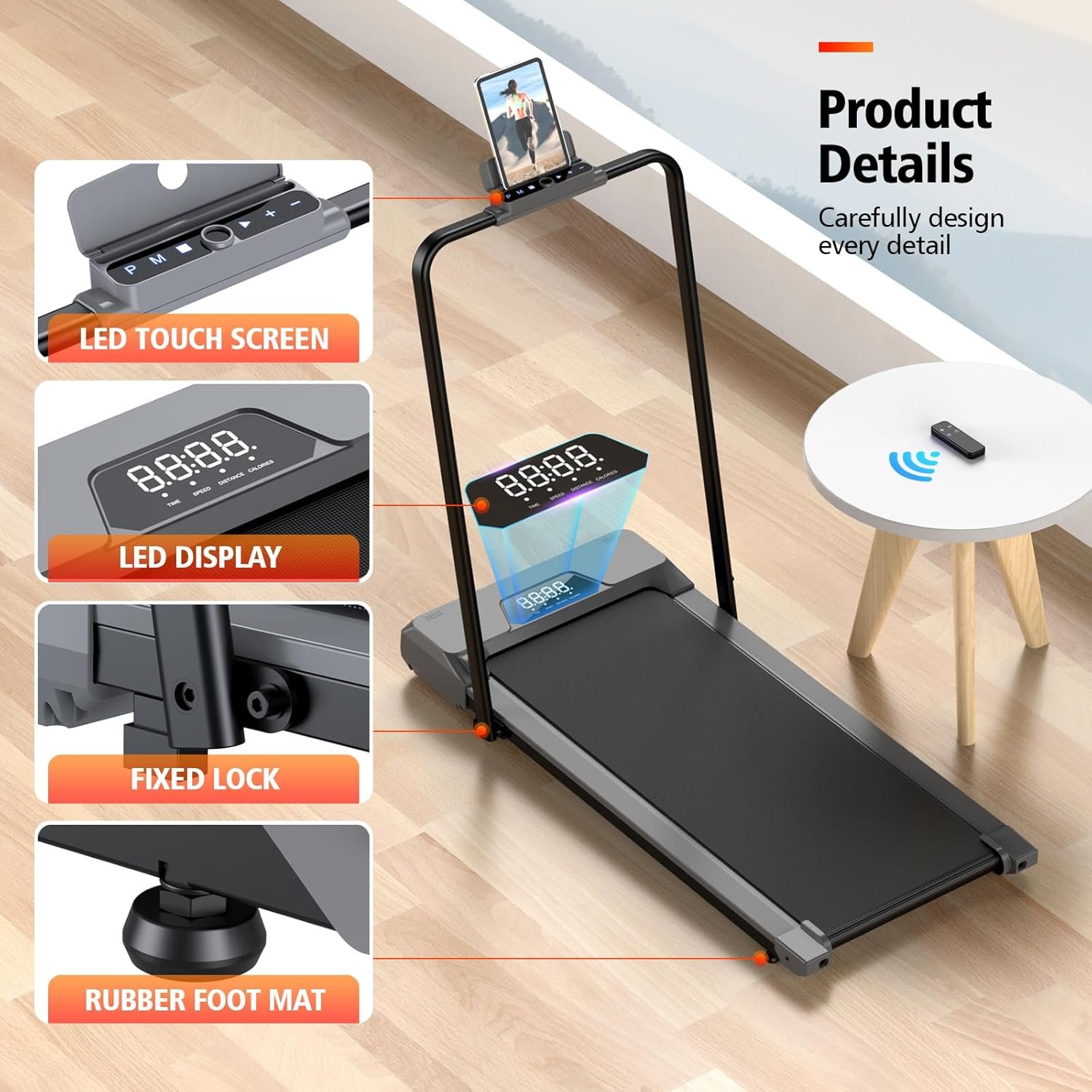 [MULTIFUNCTION LED DISPLAY AND REMOTE CONTROL] – The portable treadmill’s LED display clearly displays workout data so that you can keep up to date on your exercise status in real time. There’s a device stand on which you can put phone, exercise while watching TV, and easily video chat with friends. The remote allows you to change speed or stop, and you can use the barrier-free safety key to stop the machine immediately in case of an emergency. Imagine what a wonderful life that would be!