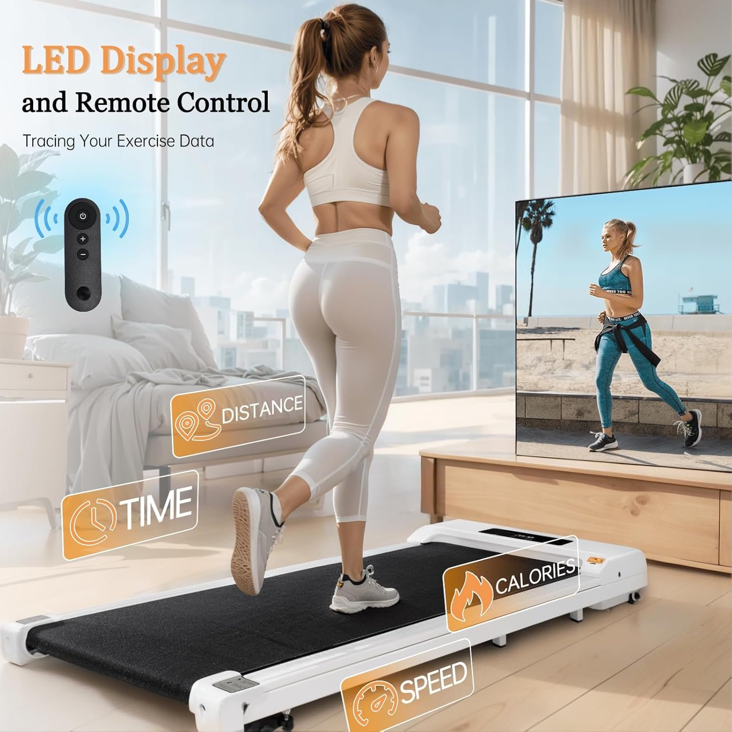 LED Display & Remote Control: The desk treadmill has an LED display showing time, calorie, speed, and distance, helping you monitor your exercise data and keep track of your fitness progress. Besides, the portable treadmill gains a remote control that allows you to easily adjust the speed and start or stop the walking pad. Whether at home or in the office, you can choose the appropriate speed according to your physical condition and exercise needs and customize a personalized fitness plan.