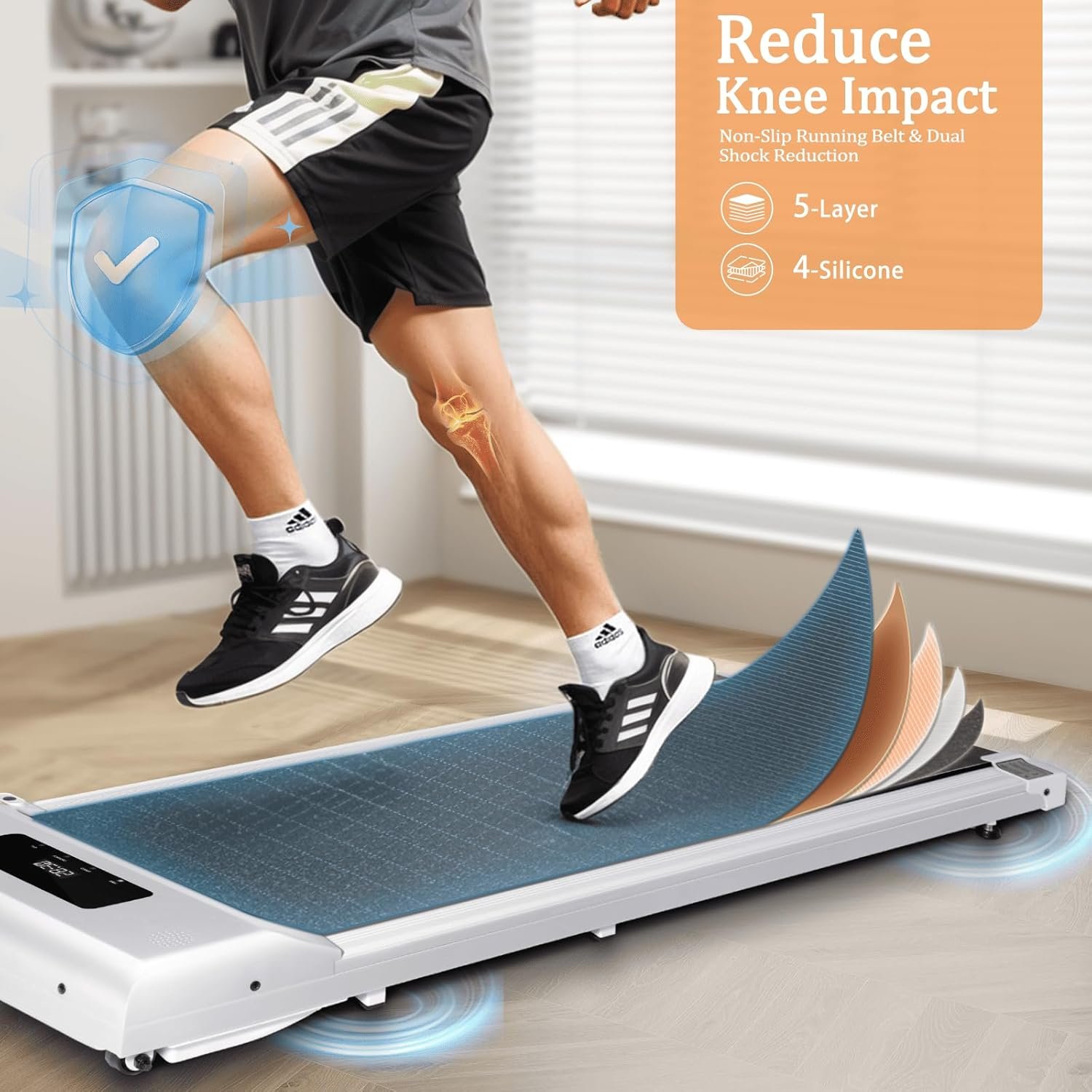 Anti-slip Running Belt and Shock Absorption System: The small treadmill adopts a solid steel frame structure to ensure long-lasting durability. Its anti-slip running belt and built-in shock absorbers can reduce impact and noise, providing safe cushioning for your knees. Whether it is a leisurely stroll or an intense jog, the under desk treadmill can provide a healthier and more comfortable exercise experience, helping you maintain your fitness habits and achieve your exercise goals.
