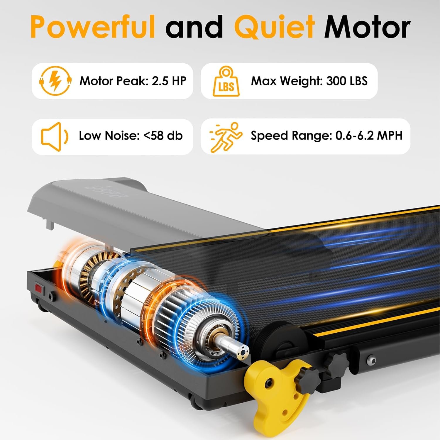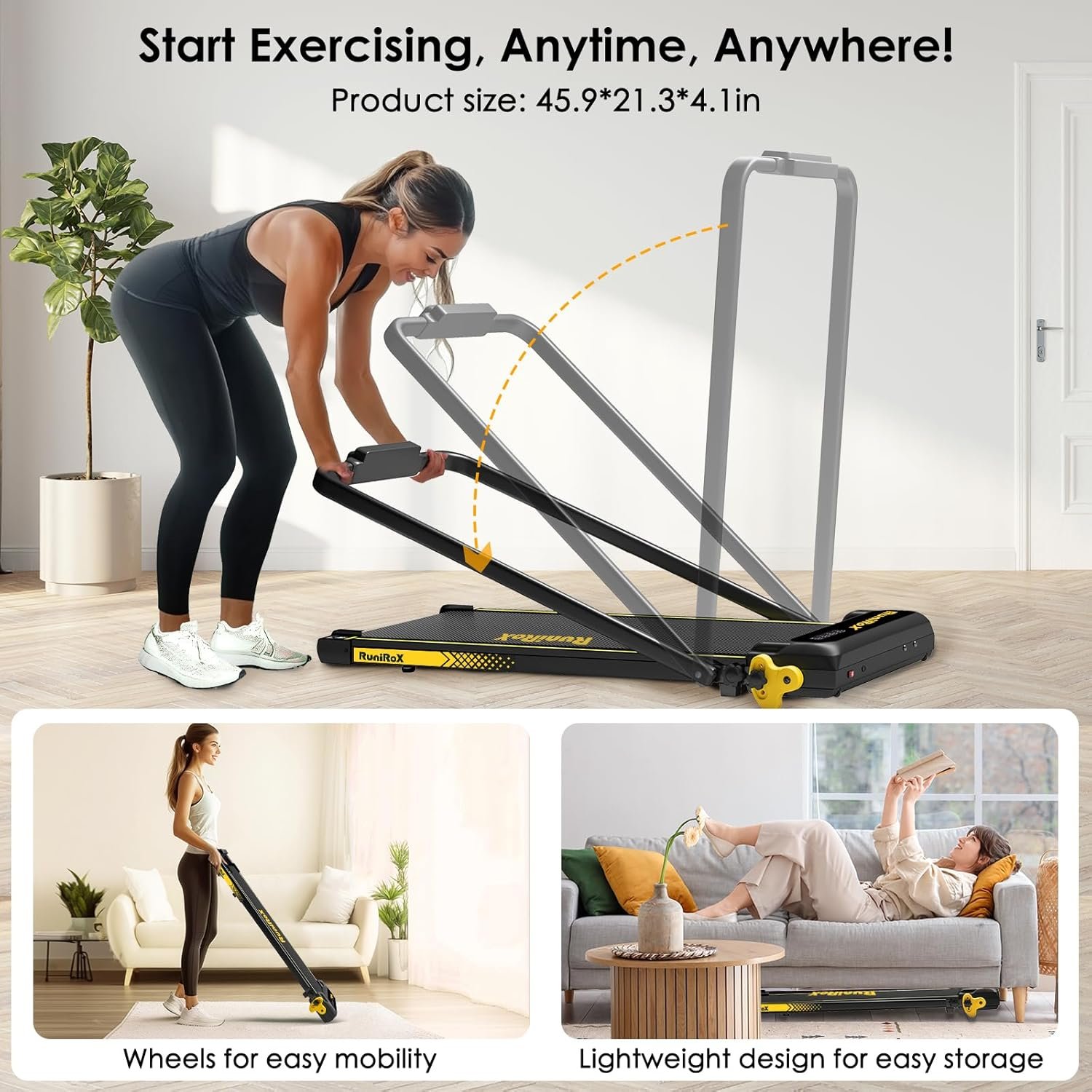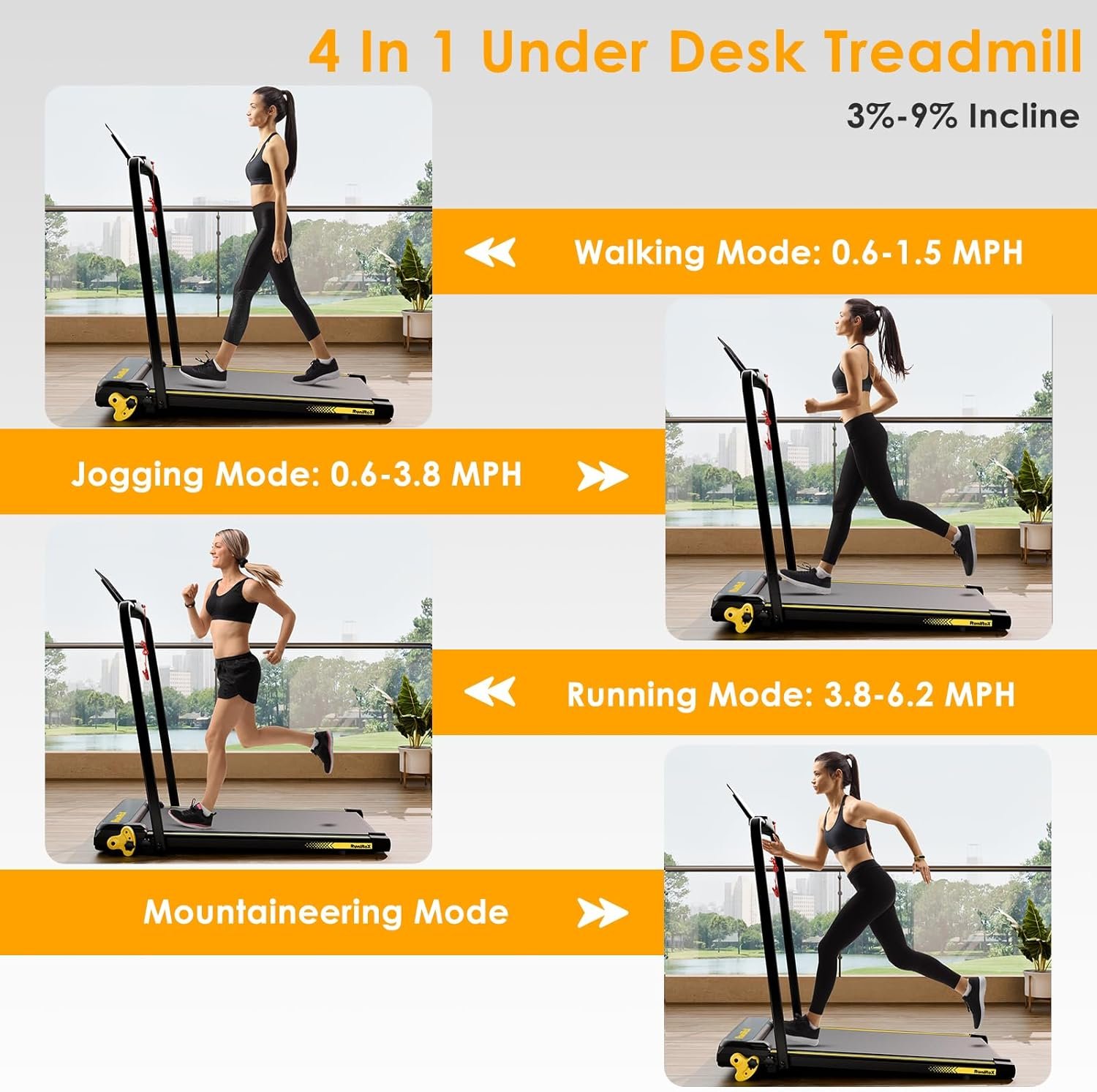 Folding Walking Pad: This walking pad treadmill offers distinct workout modes to cater to your fitness needs. You can select diverse speeds based on your exercise routine. When the handle is folded, the speed is 0.6-3.8mph. When the handle is raised, the speed is 0.6-6.2mph