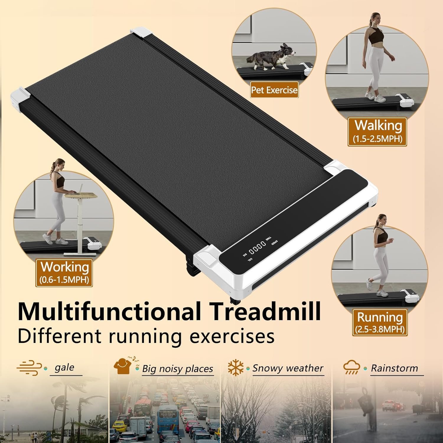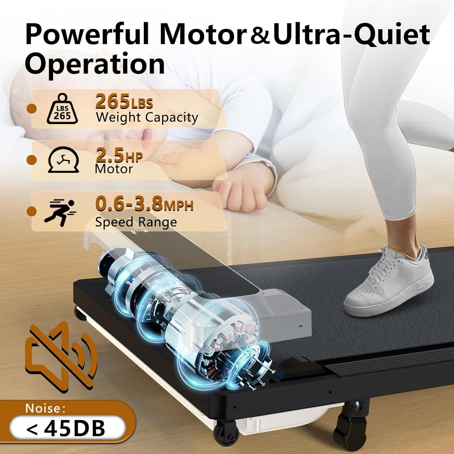Shock Absorption Design: Walking pad with Incline limiter prevents the treadmill from shifting during your exercise, which is safer. The 5-layer professional non-slip running belt design and 8 shock-absorbing pads can effectively reduce joint impact, protect the knees and ankles while buffering, and provide you with a comfortable exercise experience.
