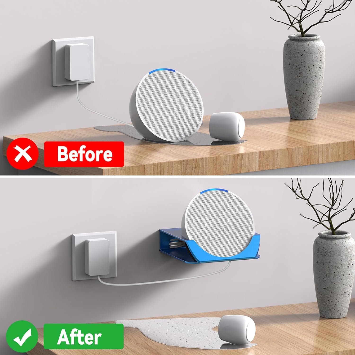 Space-Saving: The wall-mounted design of the Echo Pop stand mount helps keep your counter or desk organized, creating extra space, making it clean and tidy. If the wall bracket for Echo Pop is installed in the kitchen, it can also prevent potential damage to the device from overturned pots or water.
