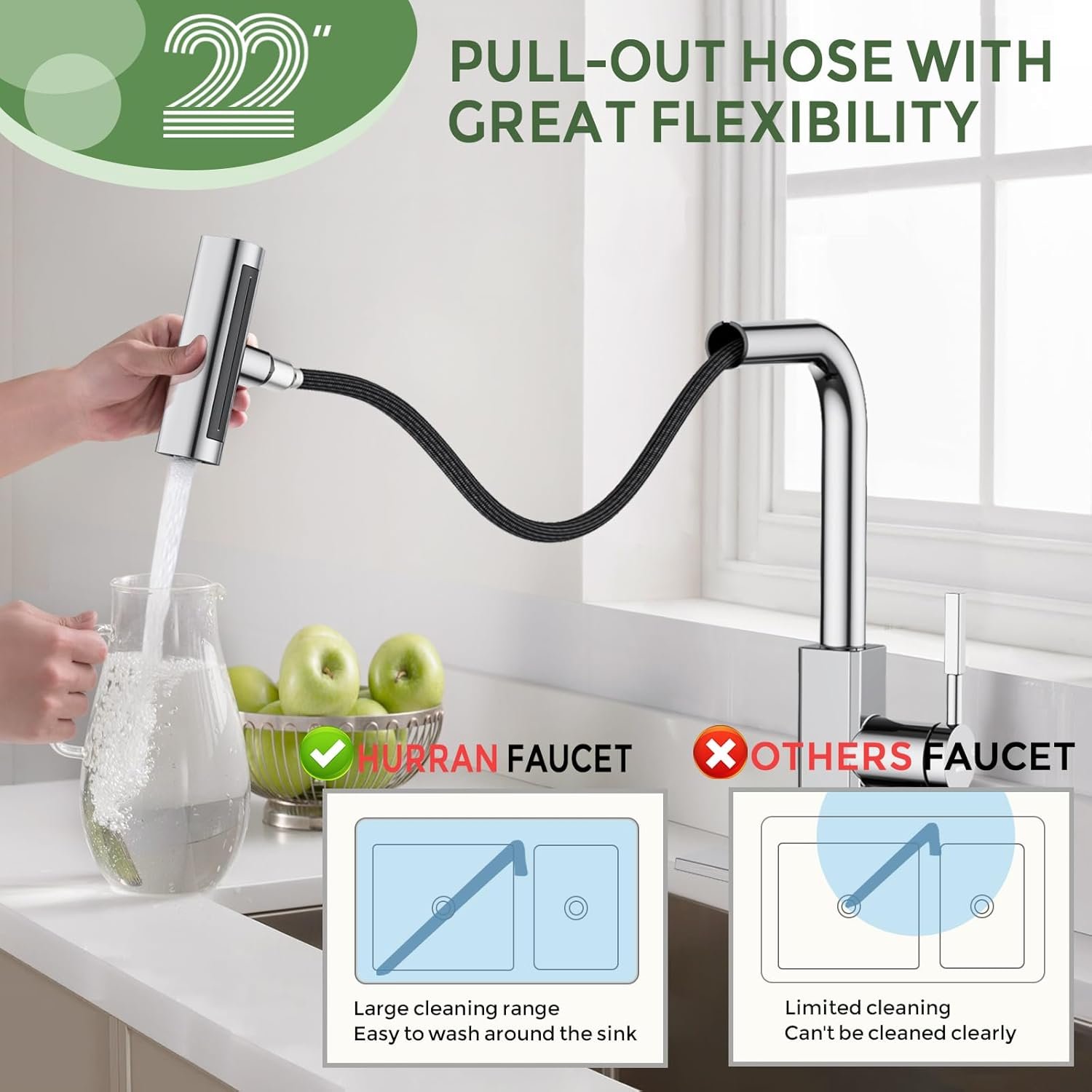 360° Rotatable and Pull-out Design: The upgraded 22-inch pull-out hose expands the range of use for everyday cleaning with great flexibility. The 360° rotatable faucet easily switches between four modes with a quick turn of the nozzle, making your life full of convenience