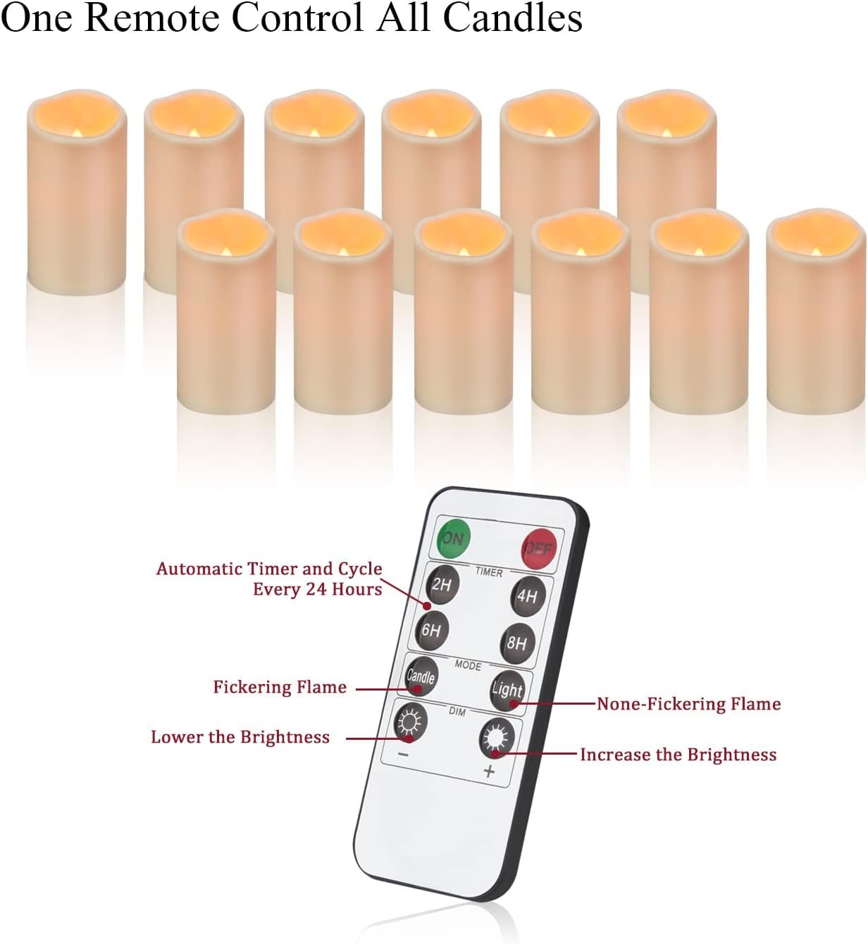 Flameless Led Candles: The waterproof flameless candles set included 12 Packs flameless candles(H 6”x D 3”), 2 remote control. Each candle is powered by 2x AA batteries(not included). If you are not using the battery candles for a long time, please switch the candles off at the bottom to save battery life