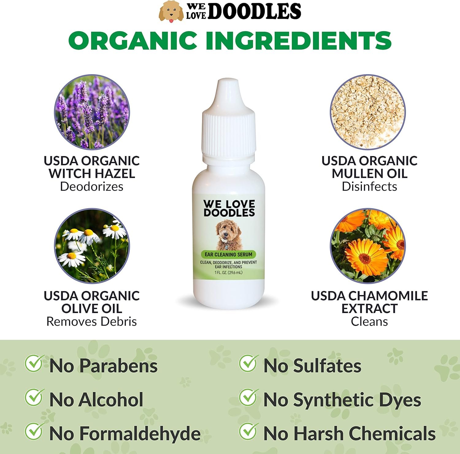 USDA CERTIFIED ORGANIC SERUM: Our dog ear cleaner uses 4 USDA Certified organic ingredients. All natural, safe, and non-irritating.