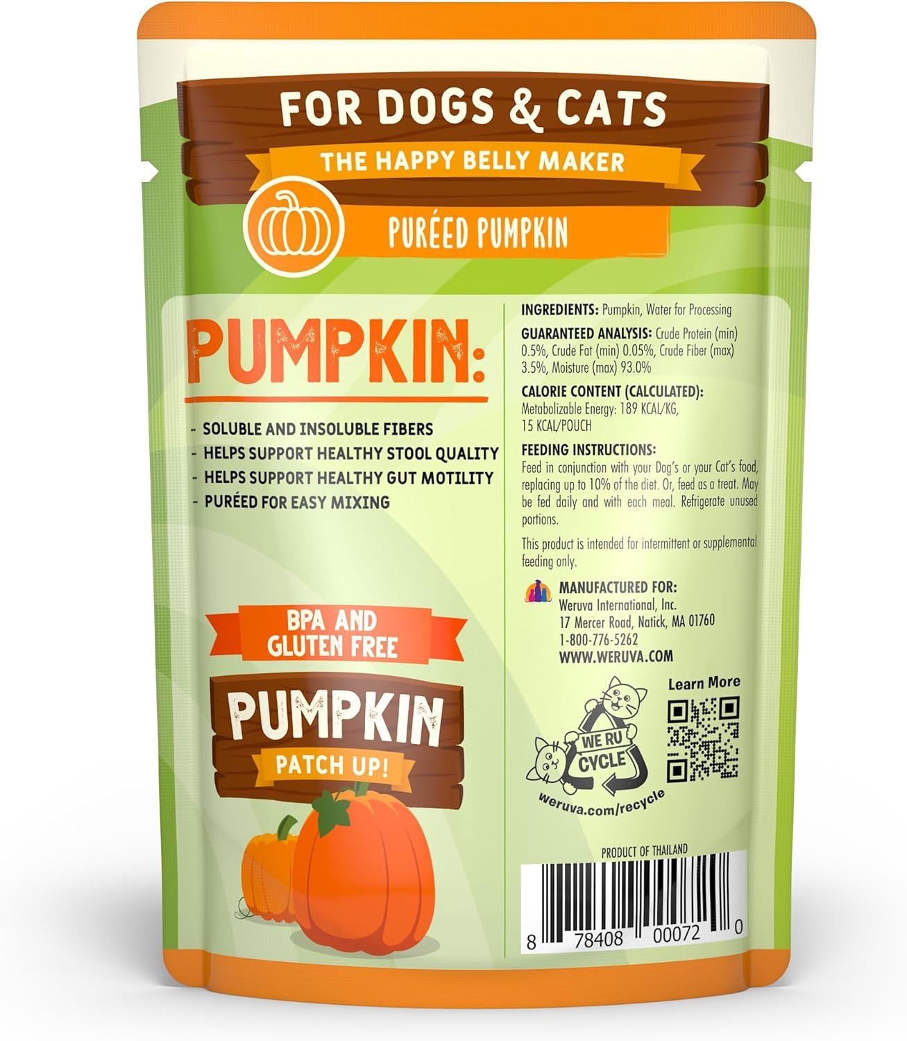 Weruva Pumpkin supplement is a great source of healthy fiber helping to support your cat’s or dog’s digestive system. We combine the healthy digestive benefits of pumpkin in an easy to serve pouch.