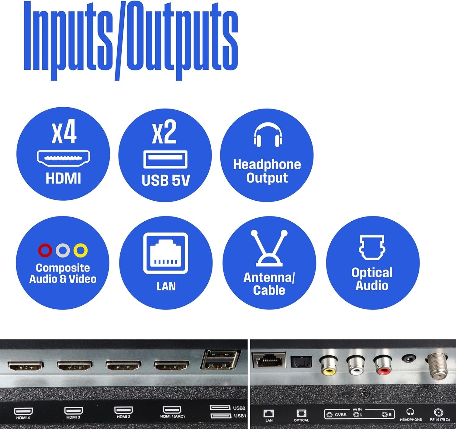 Connectivity is King – Packed with 4 x HDMI, 1 x Composite Video, 1 x Optical Digital Audio inputs for maximum flexibility. A full array of inputs to connect your cable box, game console, streaming stick, sound bar, DVD/Blu-ray player or a digital antenna for local channels.