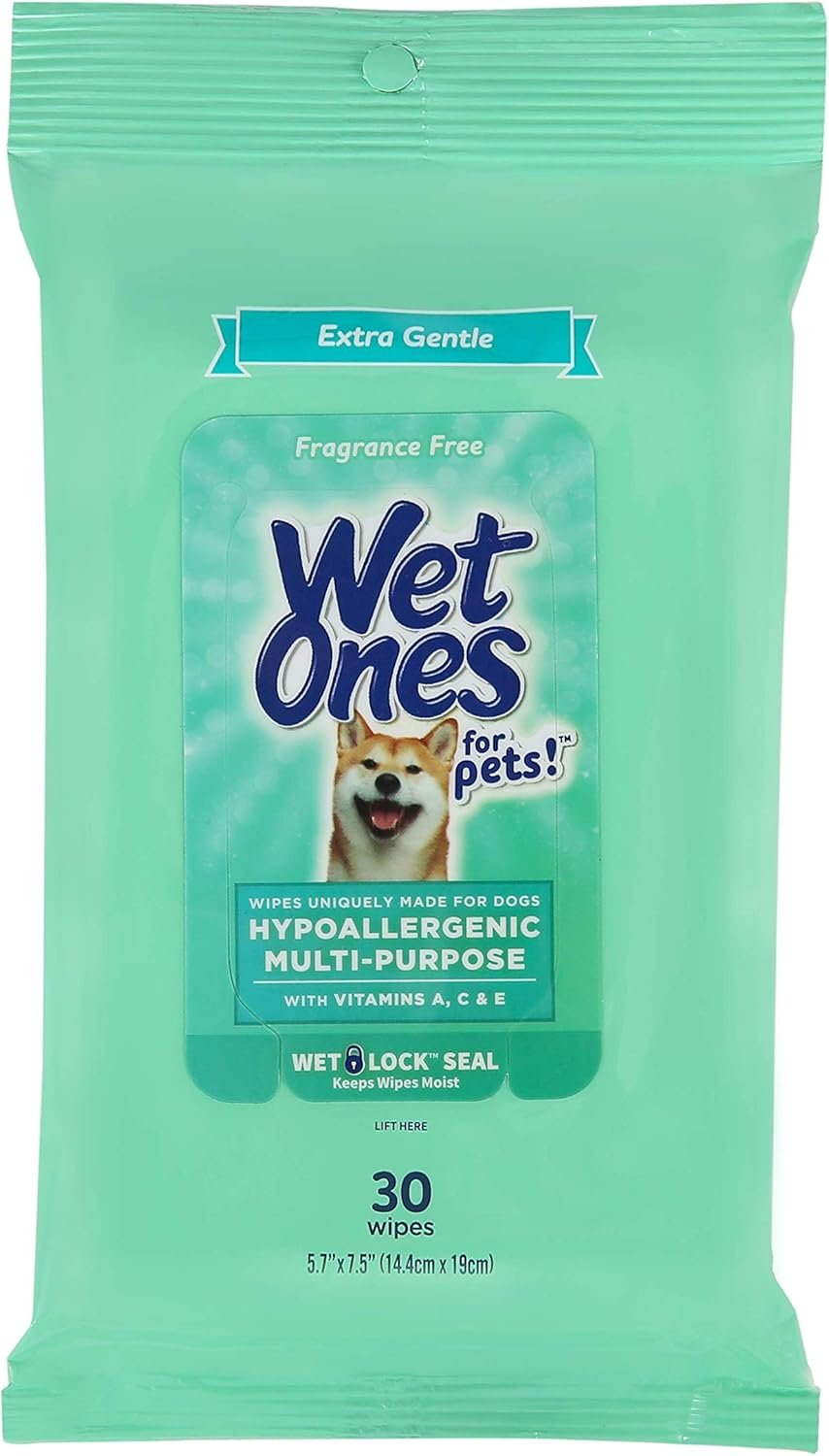 Wet Ones for Pets Hypoallergenic Multipurpose Wipes for Dogs are designed with your pet in mind for a quick, gentle, & healthy clean anytime, anywhere! These hypoallergenic wipes for dogs are a fragrance-free way to keep your pet comfortable and clean. The wipes for dogs are non-irritating, making them great for dogs with sensitive skin. Multi-purpose dog wipes remove dirt and dander while reducing allergens. They’re great wipes for dogs to use in between baths. These safe, easy to use hypoallergenic dog wipes are formulated with Vitamin A, C & E to naturally soothe, hydrate, and calm skin to help maintain a healthy, shiny coat . The 30 count pouch comes with a Wet Lock seal to maintain freshness. Made specifically for pets and safe for use after outdoor playtime or indoors, these Wet Ones antibacterial wipes keep and your home clean and smelling fresh. Directions: 1. Remove wipe from pouch and reseal to maintain freshness. 2. Wipe down dog from back of neck to tail, carefully avoiding the eyes. 3. Dispose of wipe in trash, do not flush. WARNINGS: For external use only. Safe for dogs 8 weeks of age and older. Avoid contact with eyes. Keep out of reach of children. WET ONES is a trademark of Edgewell Personal Care Brands, LLC and is used under license. ?2020 Edgewell. WET ONES and WET LOCK are trademarks of Edgewell Personal Care Brands, LLC and are used under license. ?2020 Edgewell. YOUR SATISFACTION IS OUR PRIORITY: If you have any questions or feedback, please reach out to us at Fetch 4 Pets.