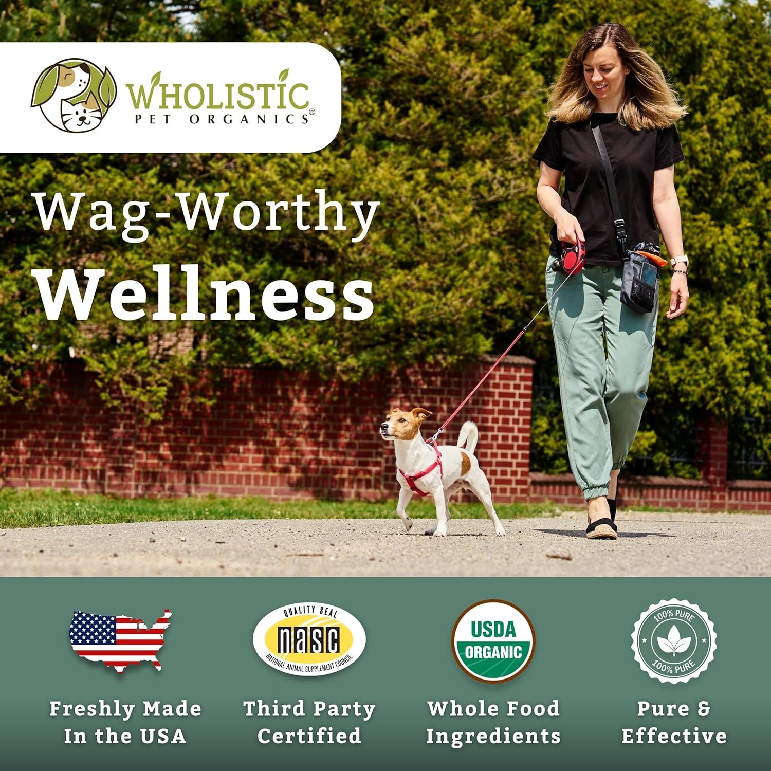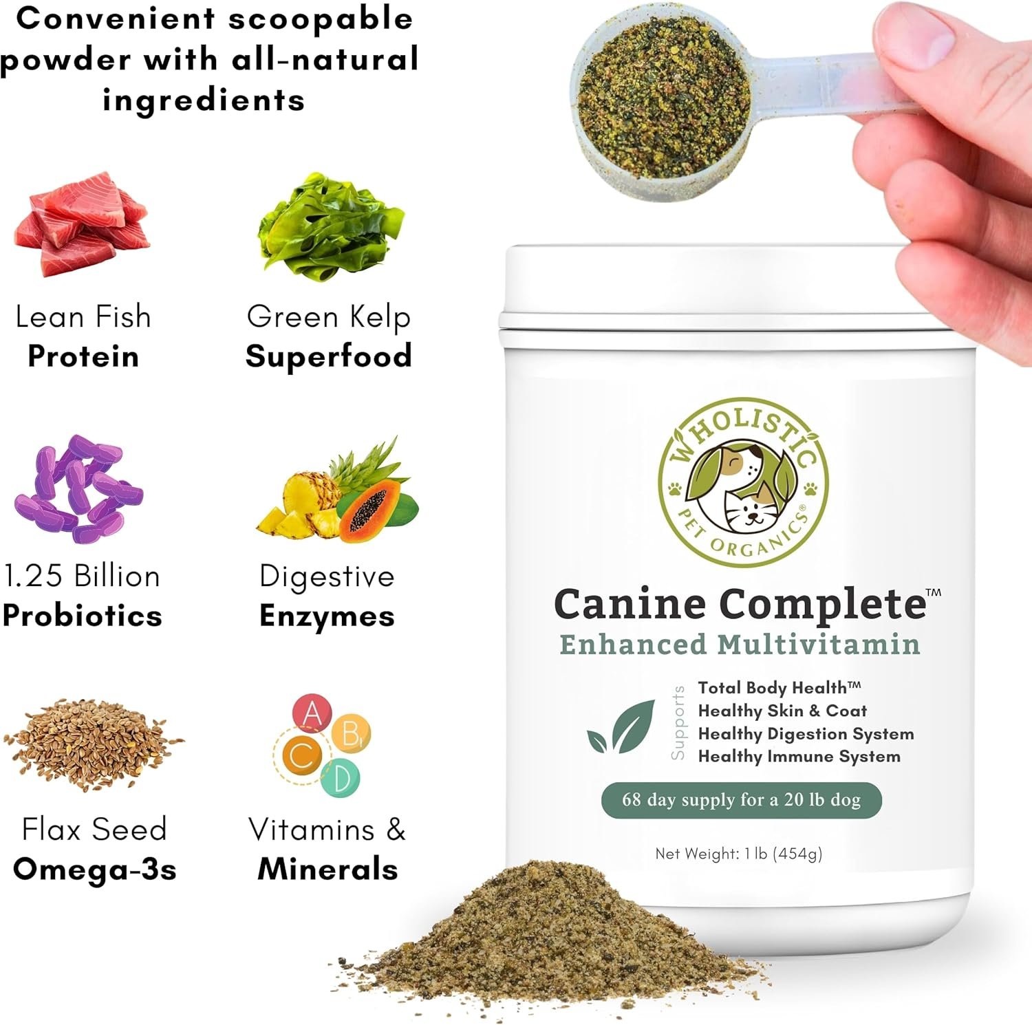 Advanced Dog Multivitamin with Probiotics: Wholistic Canine Complete features a unique blend of dog vitamins and supplements, including probiotics for digestive health.