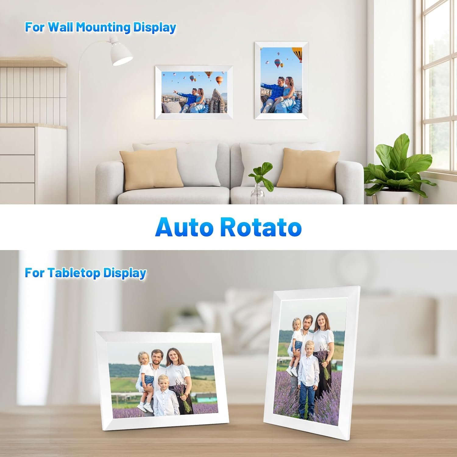 EASY SETUP & USE – WiFi digital picture frame can automatically rotate photos to adjust the direction, Come with a detachable holder as a frame stand, allowing you to view the photos in either portrait or landscape mode. Display caption, weather and clock, you can sett turn on or off. Multifunctional custom settings, such as play order, image zooming, hide/publish images, adjustable brightness, sleep mode, etc.