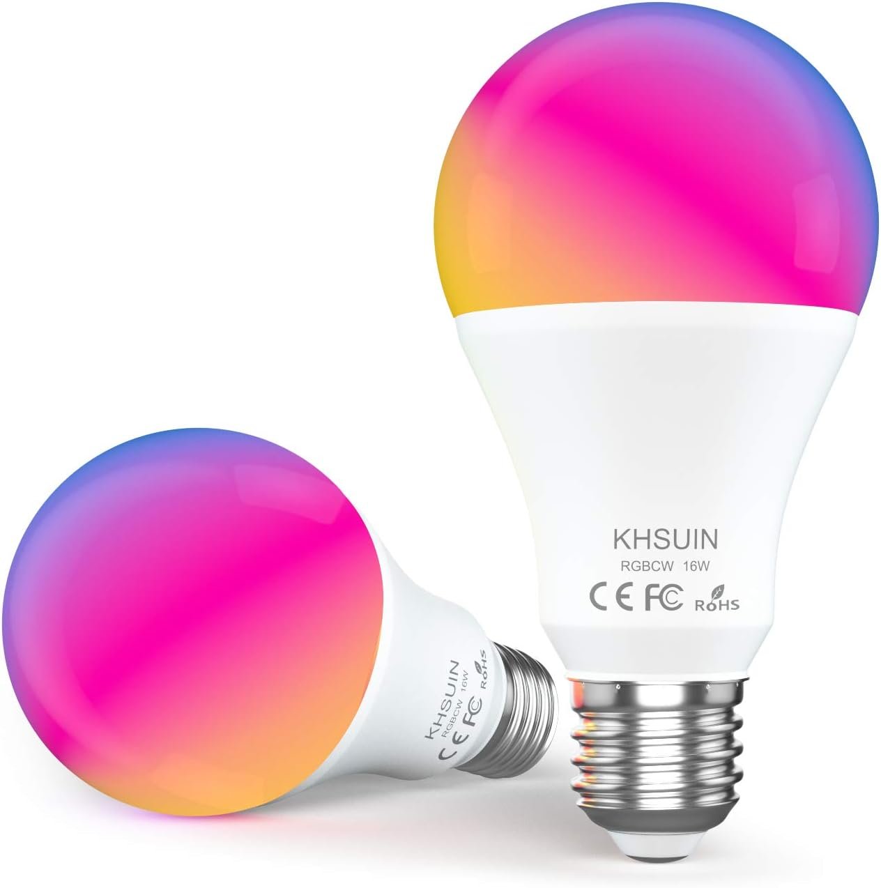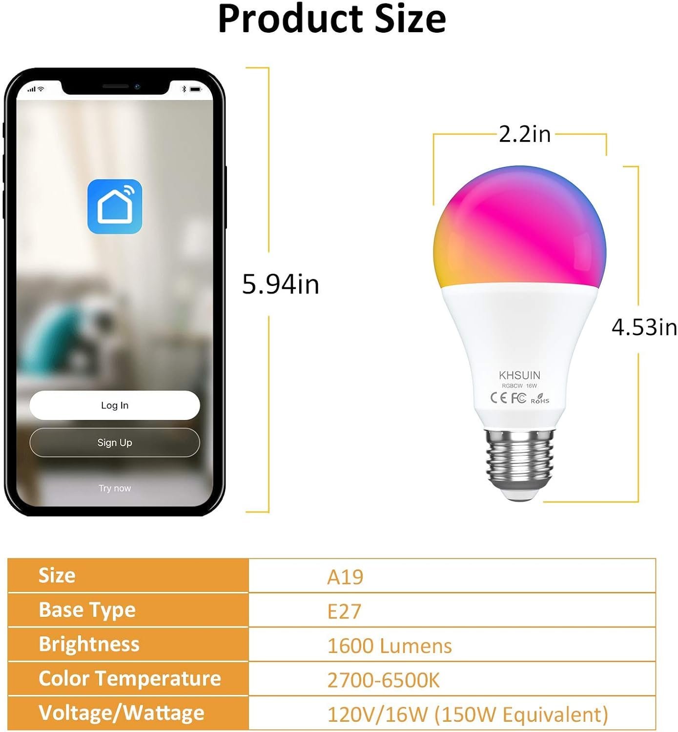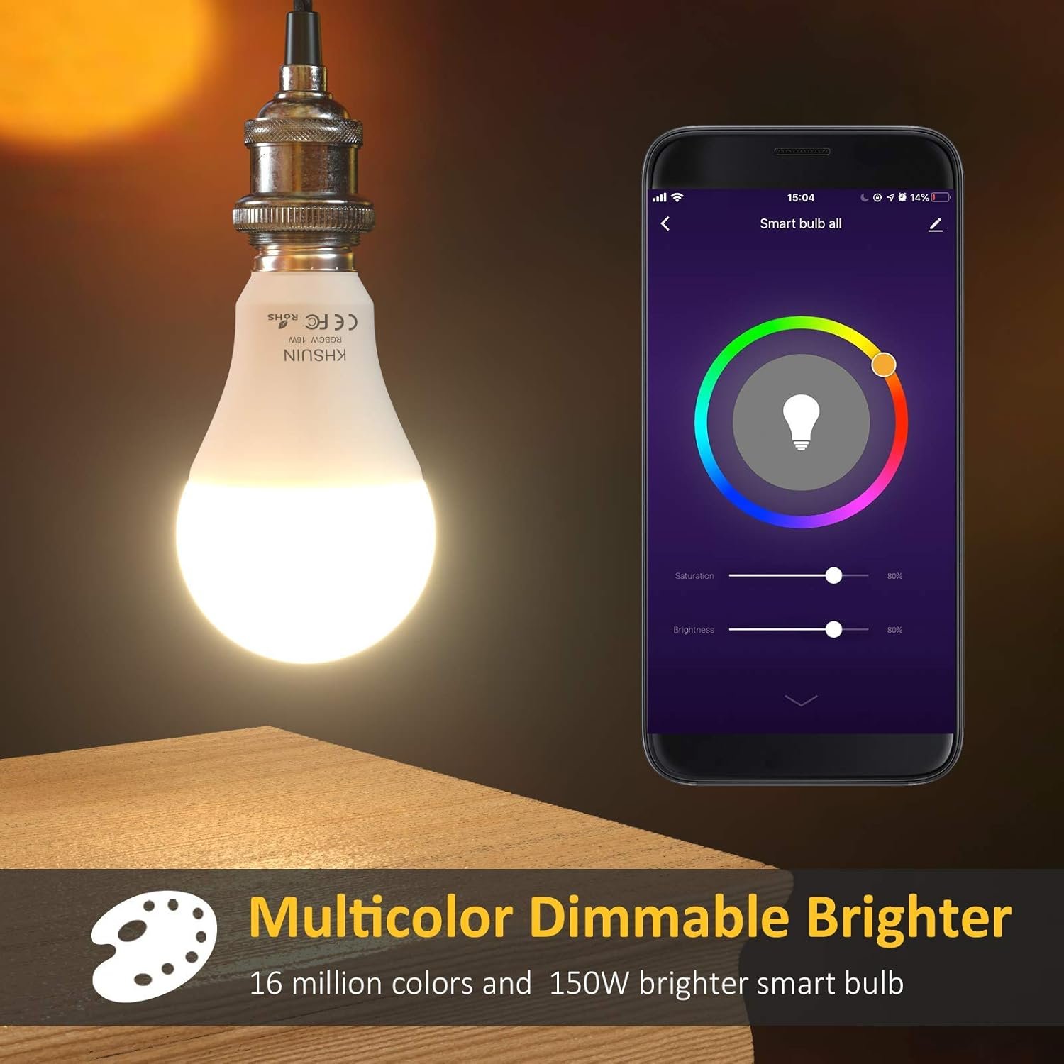 [Ultra-Bright Smart Light Bulbs] High lumen led smart bulb: 16W, 150W Equivalent, 1600lm. KHSUIN upgraded PCB and LED chips enhances light performance for family and workplace with higher wattage, lumen and better energy saving. Brighter than 7w, 9w, 10w, 12w smart bulbs, capable for installation in ascending height place regardless of descending brightness.