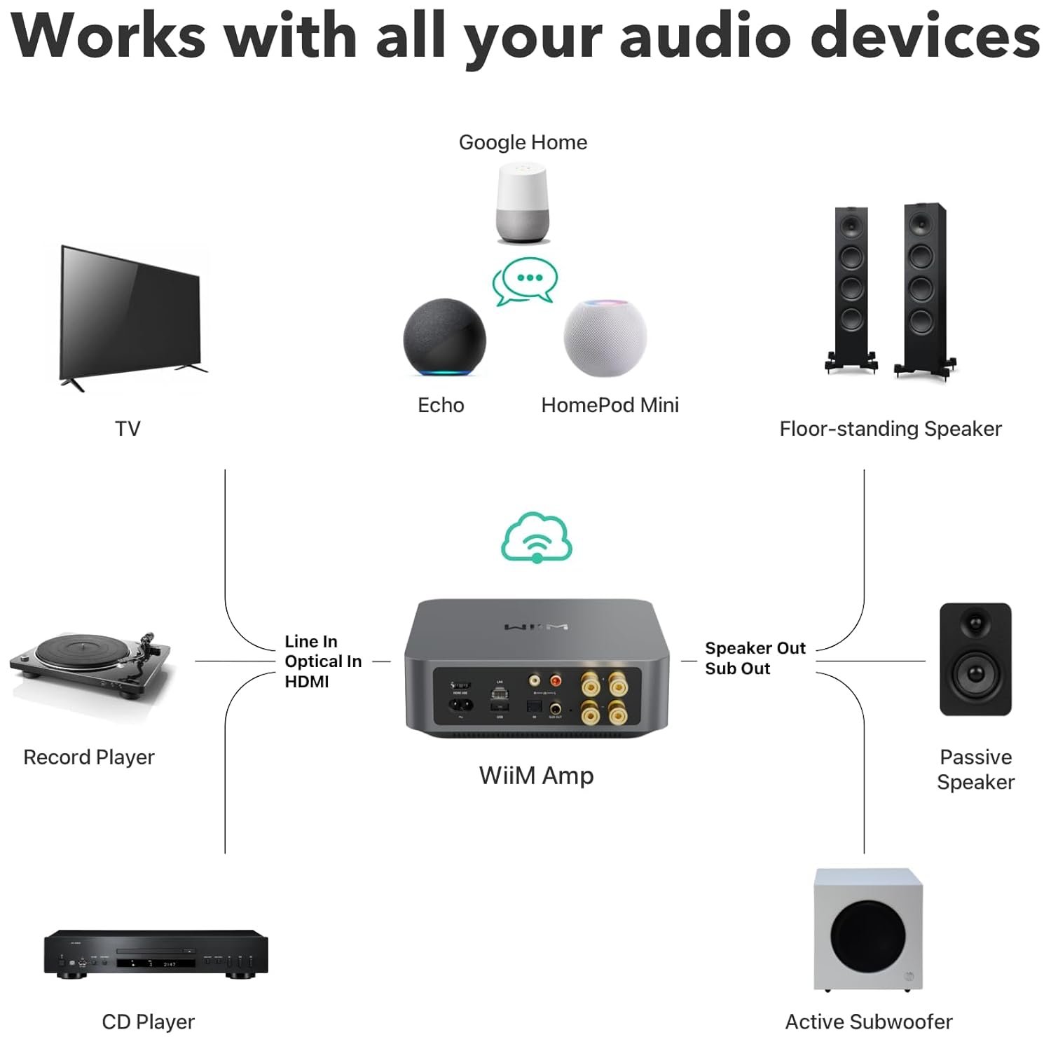 Small Yet Mighty – Transform your passive speakers into smart audio powerhouses with the WiiM Amp. Don’t let its compact design fool you – this amplifier packs 60 Watts per channel at 8 ohms, and a whopping 120 Watts per channel at 4 ohms. Whether you’ve got floor-standing, architectural, outdoor, or bookshelf speakers, the WiiM Amp has you covered. Seamlessly connect your TV or turntable to enjoy unparalleled audio fidelity that will elevate your listening experience to new heights.