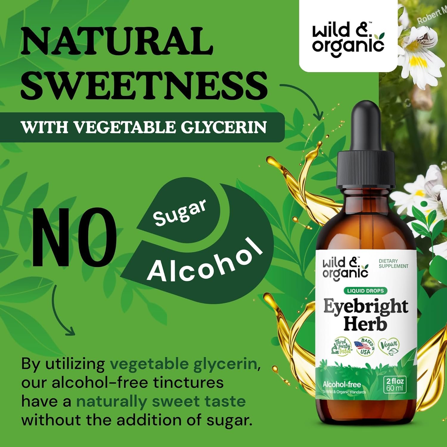 Sweetness Without Sugar: Enjoy a pleasant supplement experience with Wild & Organic eyebright drops, which feature a naturally sweet taste. Our liquid eye bright powder supplement uses glycerin for natural sweetness, with no added sugar.