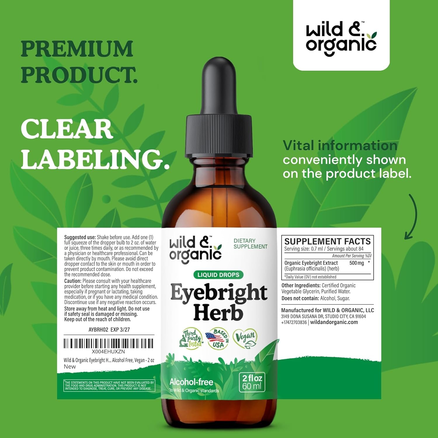 Eye Support: Each serving of Wild & Organic eyebright tincture contains 500 mg of eyebright extract to support your eyes.