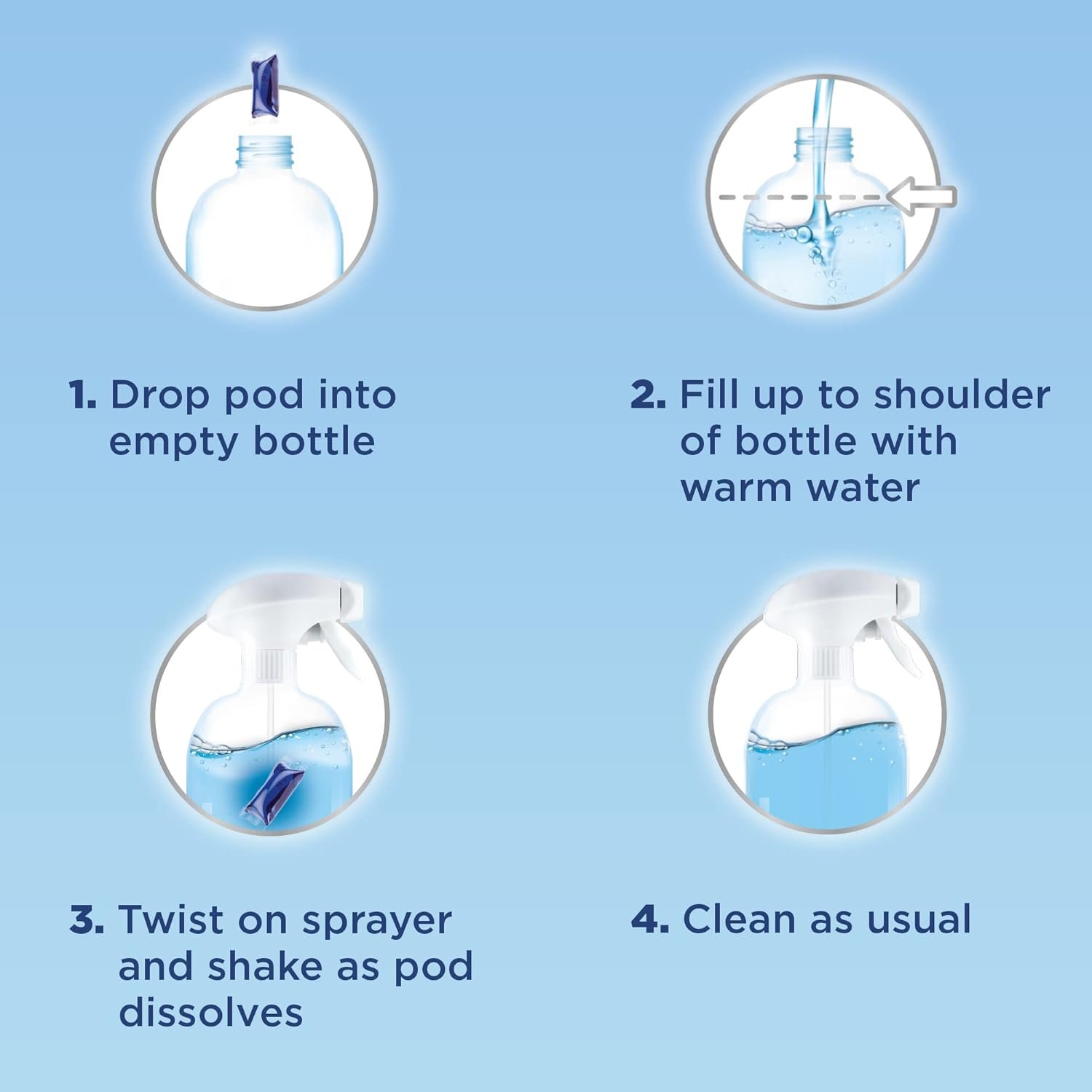 Easy to use! Just drop one pod into the empty bottle, fill up to shoulder with warm water, twist on sprayer, and shake until pod dissolves
