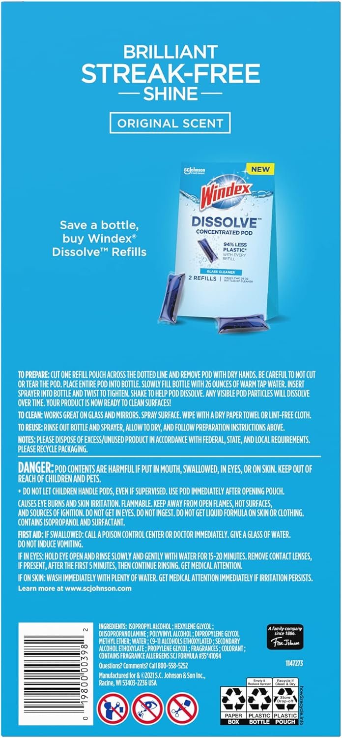 Windex Dissolve Concentrated Pod Glass Cleaner packs all the cleaning power you need to make one full 26 oz. bottle of Windex Glass Cleaner , an easy clean and bright shine perfect for windows, mirrors, glass shower doors, glass stove tops, and more. Refilling your Windex Dissolve Concentrated Pod Glass Cleaner is a small act that helps you reduce plastic waste. The future of cleaning is here! Little pod, big impact.