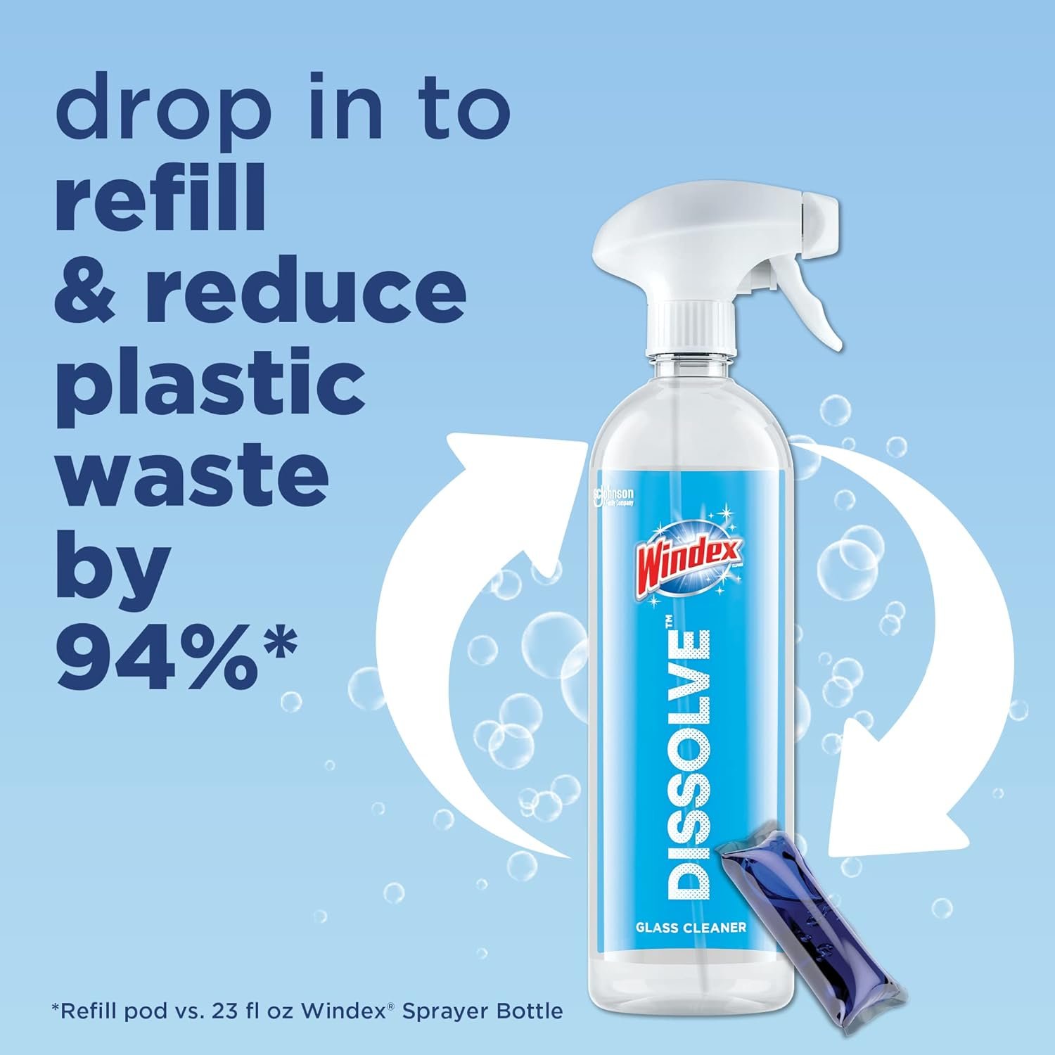 Windex Dissolve Starter Kit contains a reusable spray bottle and one concentrated pod. Every pod refill helps reduce plastic waste by 94%*. Plus, it s easy to use! Just drop a pod into the empty bottle, fill bottle up to the shoulder with warm water, twist on the sprayer, and shake until the pod dissolves. Discover the power of less, and choose dissolvable, not disposable.