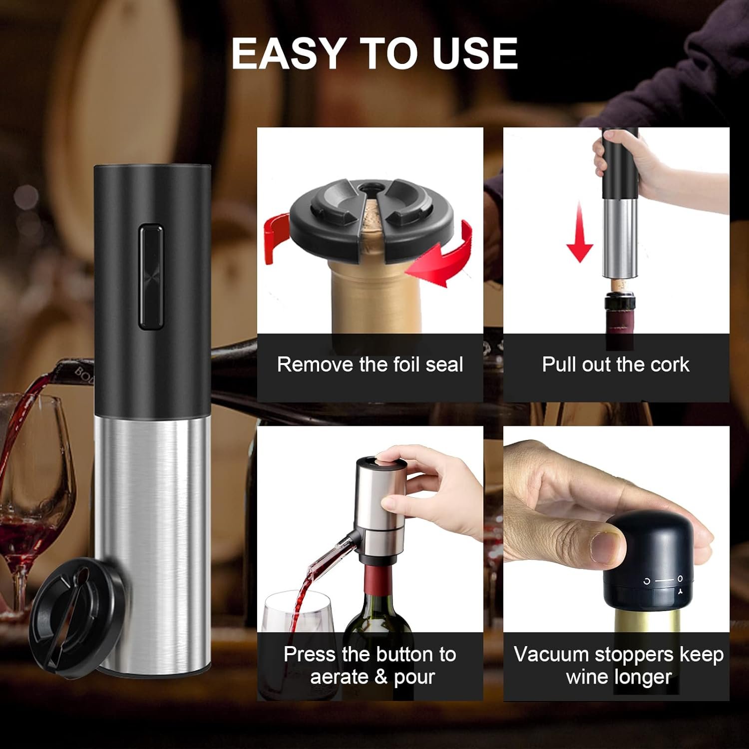 EFFORTLESS USAGE: Remove the foil seal with the foil cutter.Then,easy to pop open a bottle just in 6 seconds with the wine opener and it has longer using life than other battery operated opener. Dispenser makes wine pouring smooth and aerate wine quickly with the press of a button. And when the party comes to an end, simply seal up the bottle with the bottle stopper, which can keep wine fresh up to seven days.This process provides a first-class wine-drinking experience at an affordable price.