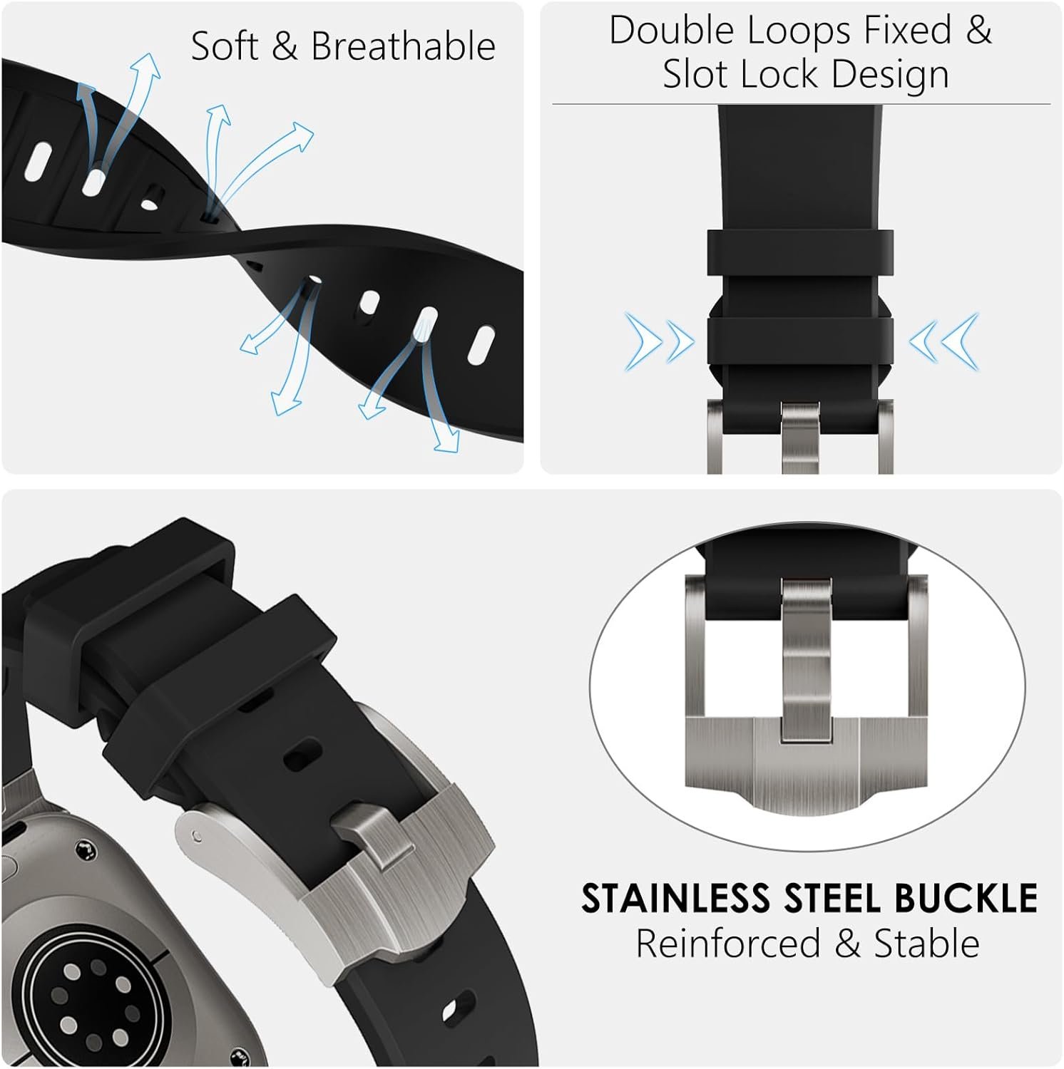 The metal buckle & adapter is made of premium 316L stainless steel.Stainless steel buckle is safe and durable.