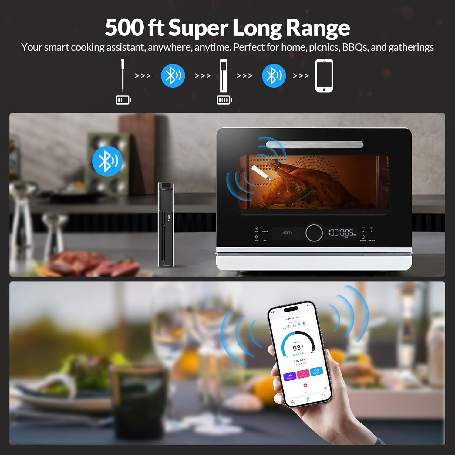【Wireless Range】 Wireless meat thermometer with Bluetooth range of up to 500 feet, allowing you to remotely monitor your cooking from anywhere in your home.Walk around and enjoy quality time with family and friends without the hassle of constantly checking the grill. Get perfectly cooked meals every time.