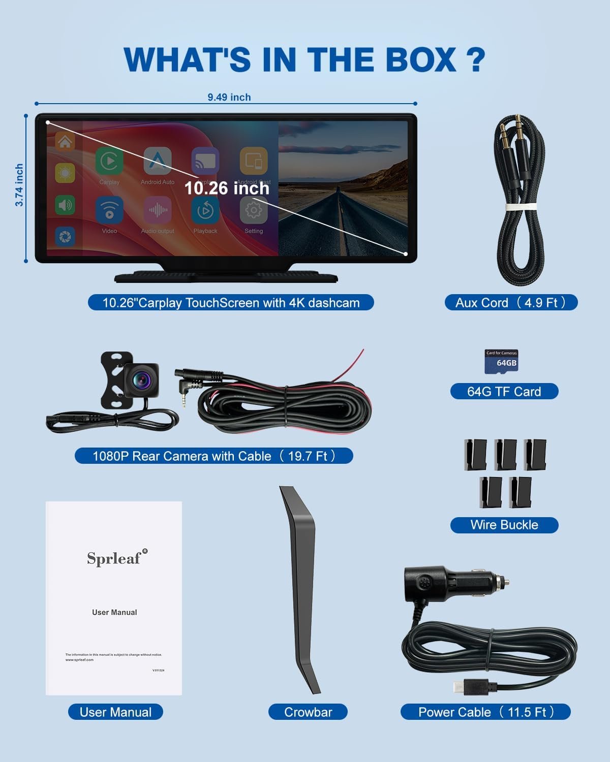 4K Dash Cam & 1080P Backup Camera- SPRLEAF Carplay screen for car integrated Dual Cam system, with a front 4K dashcam and waterproof HD 1080P rear camera. Capture every detail for safe parking and enhanced security. The backup camera displays clear rear views on the 10.26 inch widescreen display, vital for those with limited visibility behind the vehicle.
