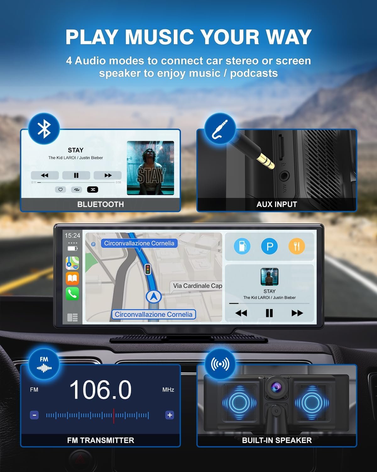 Wireless CarPlay/ Android Auto Screen – Portable Car Play screen for cars without it, compatible with Apple Carplay and Android Auto. Easy access apps, FM radio, music, navigation, calls and messages directly from SPRLEAF Smart touchscreen. Auto connect after first setup, making daily commute more enjoyable and stress-free.