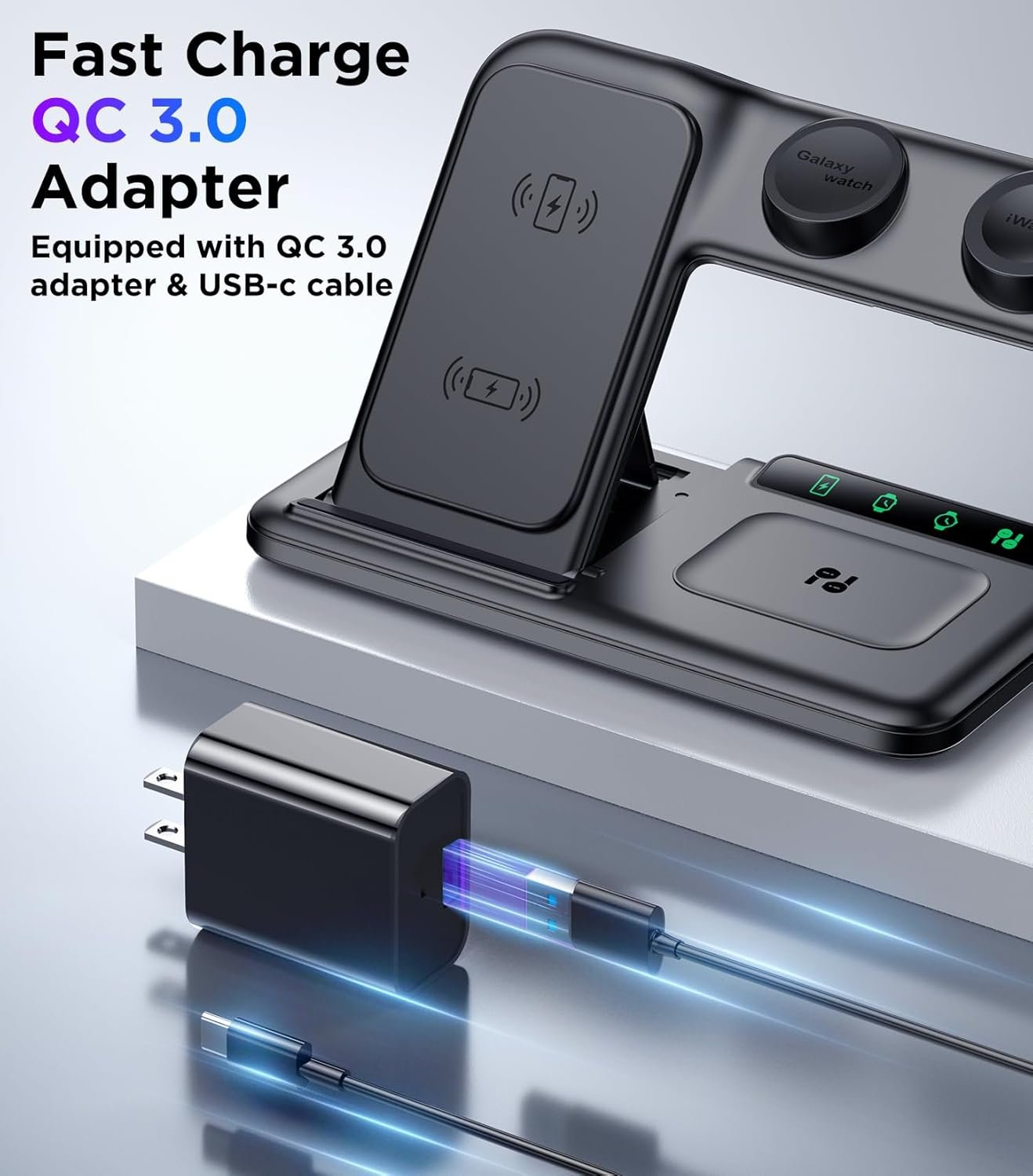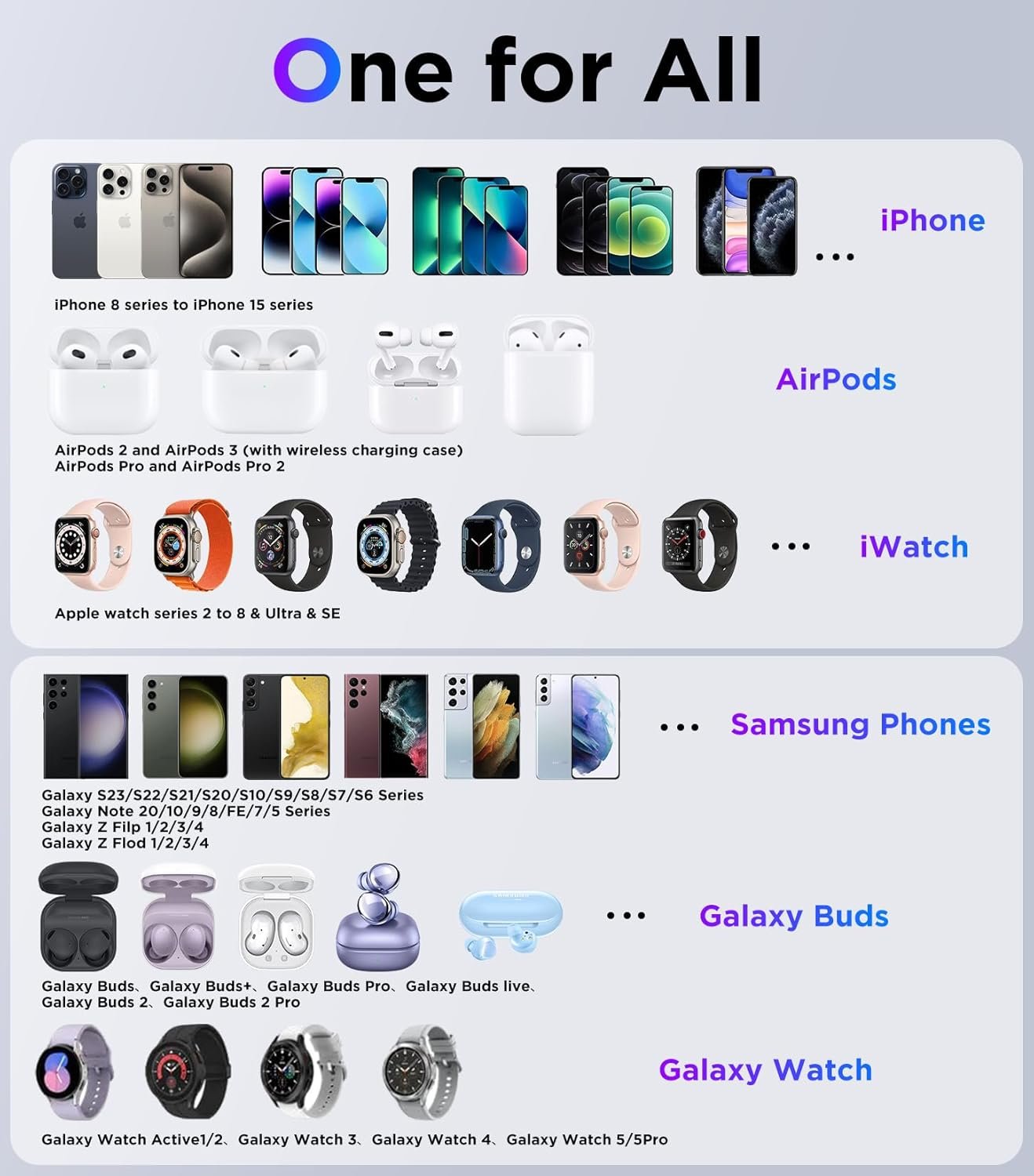 【4 in 1 Wireless Charger】This charging station is a versatile solution for charging multiple devices simultaneously. It is compatible with a wide range of devices, including iPhone 15/14/13/12/11/XS/XR/X/8 Series, Samsung Galaxy/Fold/Note Series. It also supports Apple Watch 8/7/6/5/4/3/2/SE, Galaxy Watch 6/5 pro/5/4/3/Active 1/2, Airpods Pro/3/2 with wireless case (not for Airpods 2 non-wireless version), and Galaxy Buds 2 Pro/Buds Pro/Buds/Buds+/live. This charging station is a must-have for Apple and Samsung fans, eliminating the need for individual chargers.